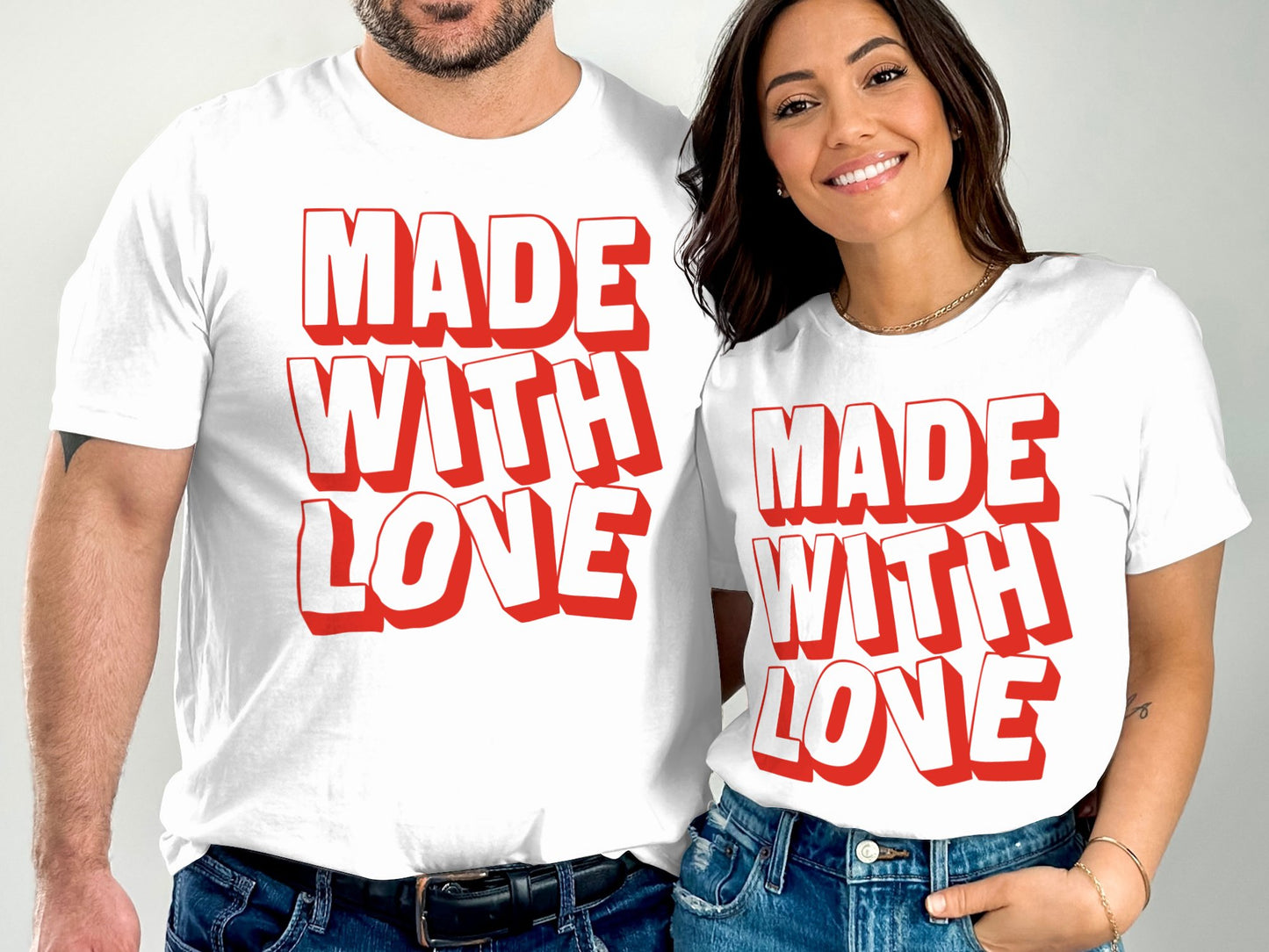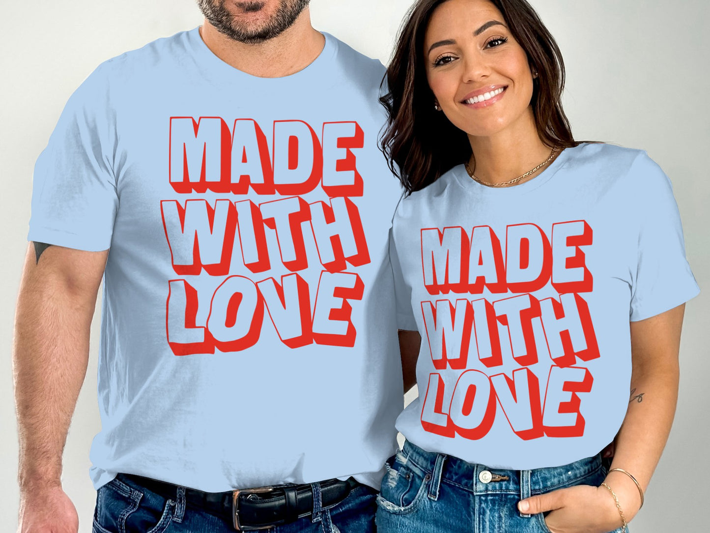 This "Made With Love" T-shirt is the perfect blend of comfort and style. Crafted from high-quality, soft cotton, it offers a relaxed fit that's ideal for everyday wear. The bold red and white text adds a touch of fun and positivity to your wardrobe. Great for casual outings, this T-shirt makes a wonderful gift for friends and family. Express your love and joy effortlessly with this vibrant and eye-catching design.