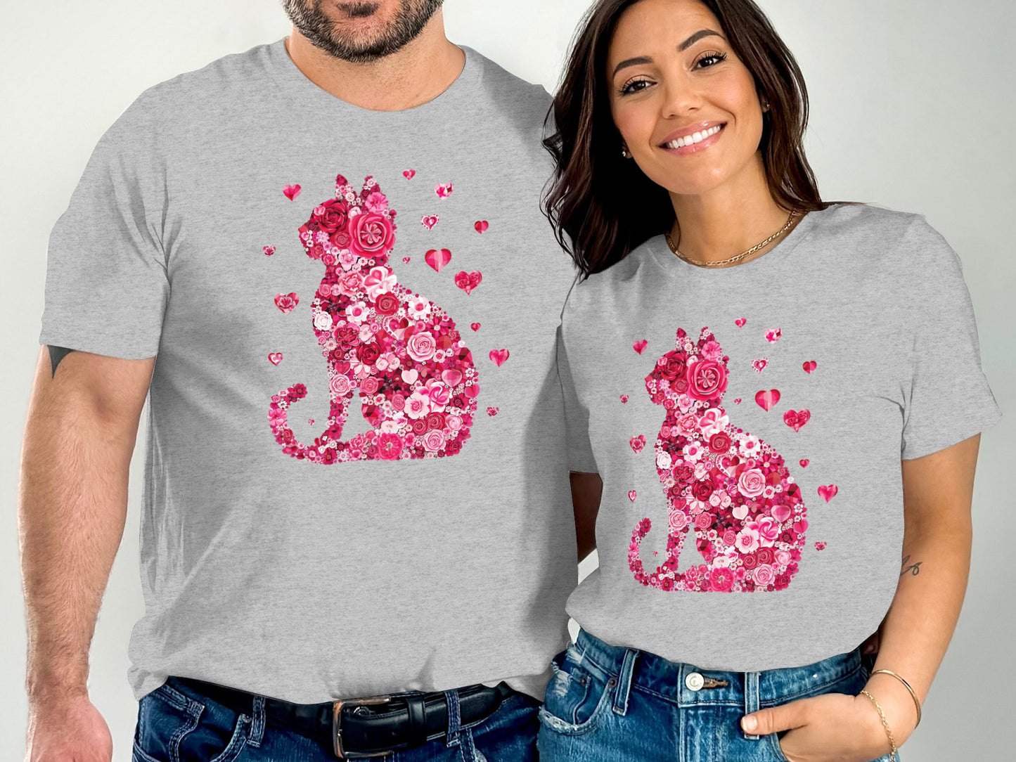 This vibrant cat-themed t-shirt features a unique design made entirely of pink and red floral elements, perfect for cat lovers and flower enthusiasts alike. The intricate pattern creates a stunning and eye-catching visual effect, making it a great addition to any casual wardrobe. Crafted from comfortable and durable materials, this t-shirt is ideal for everyday wear or as a thoughtful gift.