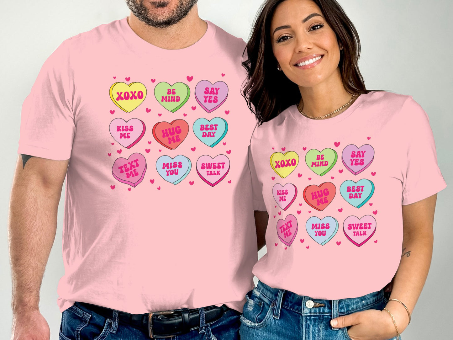 Celebrate love and positivity with our vibrant and fun T-Shirts featuring colorful conversation hearts! Each shirt displays playful messages like "XOXO", "Be Mind", "Say Yes", and more, making it the perfect gift for friends, family, or that special someone. Made from high-quality materials, these shirts are comfortable, durable, and perfect for both casual wear and special occasions. Show your sweet side and express your feelings with our unique and charming designs.