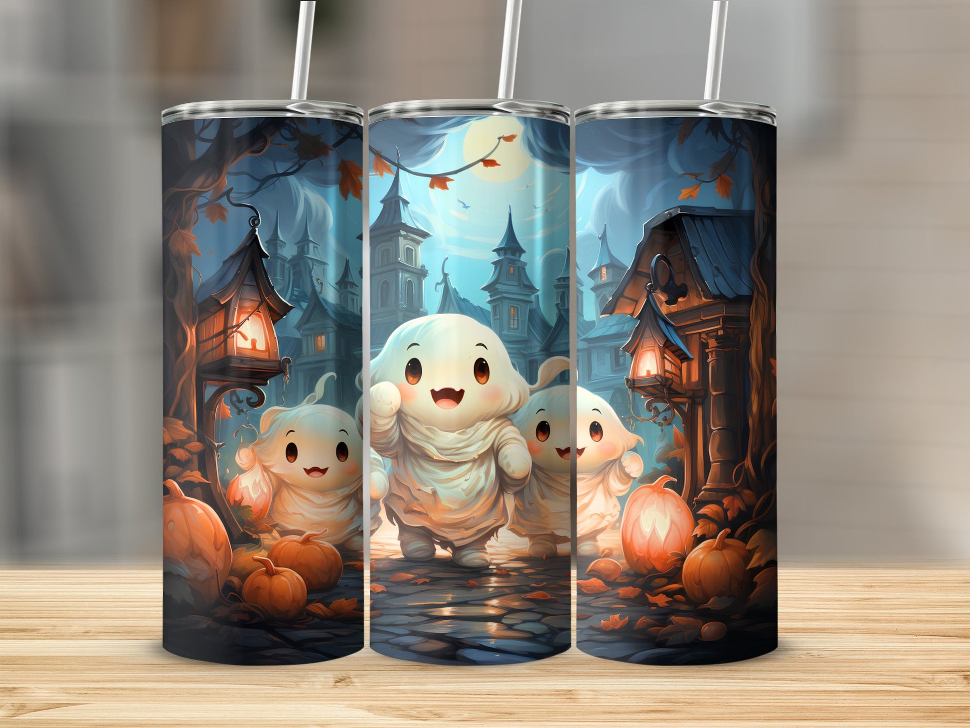 This Halloween Ghosts Tumbler features an adorable ghost family in a spooky yet charming night scene. Perfect for enjoying your favorite beverages during the fall season, this cute and festive tumbler will bring a smile to your face with its delightful Halloween design. The vibrant autumn colors and playful ghosts make it a great addition to your seasonal decor or a fun gift for friends and family.