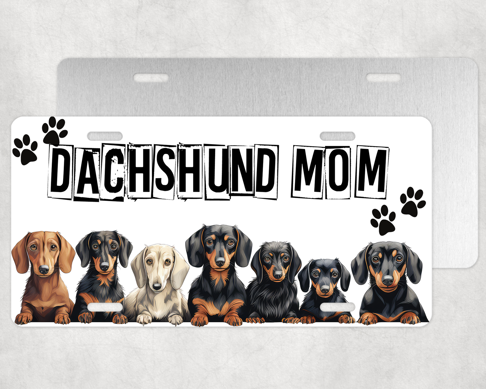 Show off your love for dachshunds with this playful Dachshund Mom License Plate! Made of high-quality aluminum and decorated with sublimation, this 12" x 6" plate allows for endless possibilities of displaying your favorite sports team, a funny saying, or your artistic talents. A must-have for any proud dachshund mom!