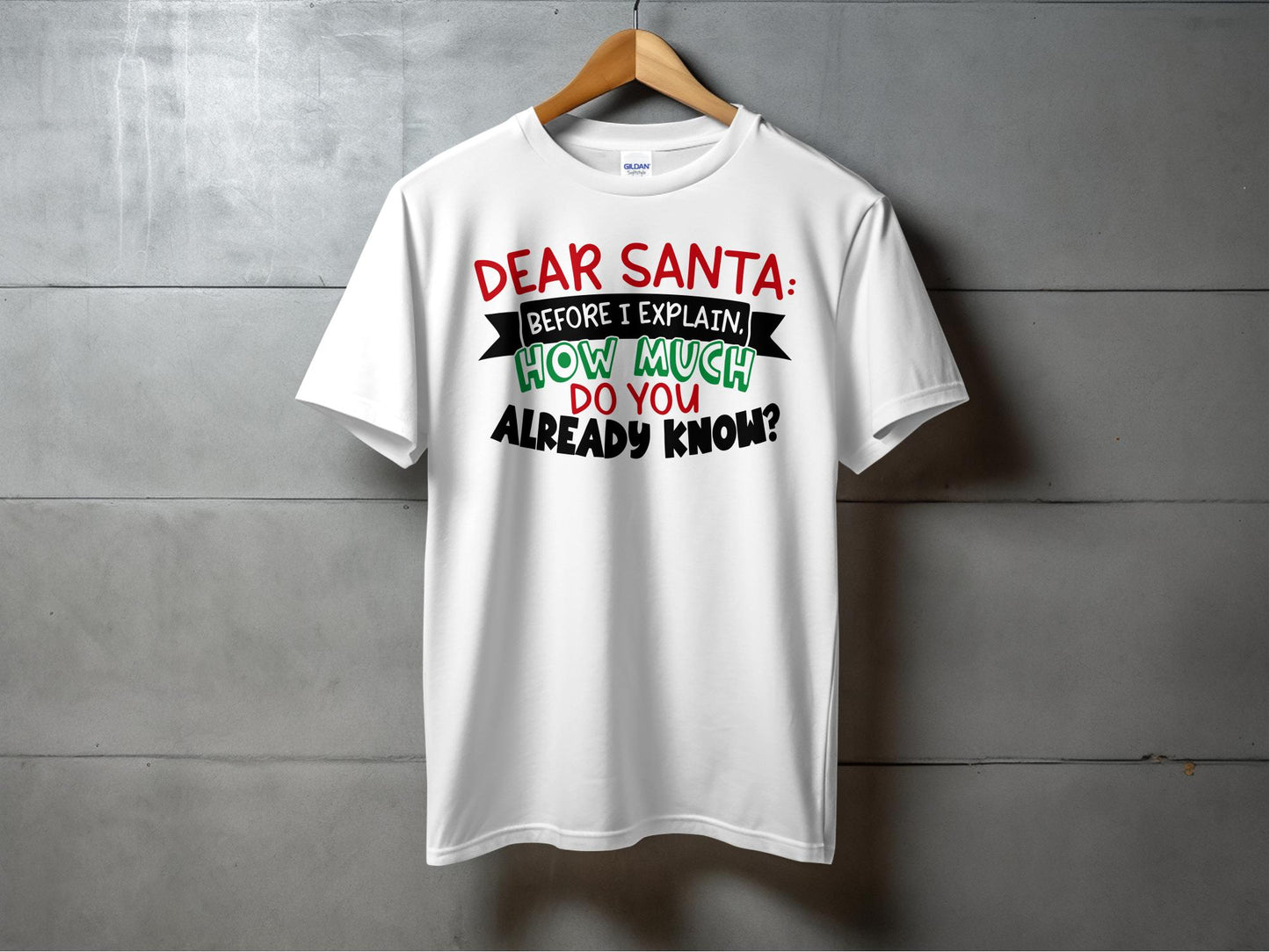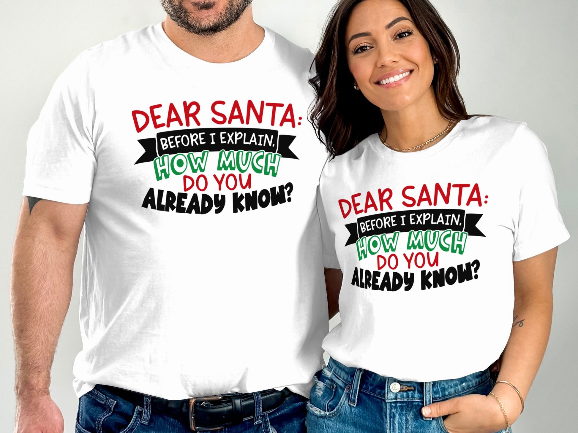 Get ready for the holidays with our hilarious "Dear Santa: Before I Explain, How Much Do You Already Know?" T-shirt. Perfect for adding a touch of humor to your festive wardrobe, this shirt is made from soft, comfortable cotton and is great for casual wear, holiday parties, and gifts. Available in various sizes to fit anyone who loves a good laugh during the Christmas season. Share the joy and laughter with friends and family by wearing this fun and festive tee!