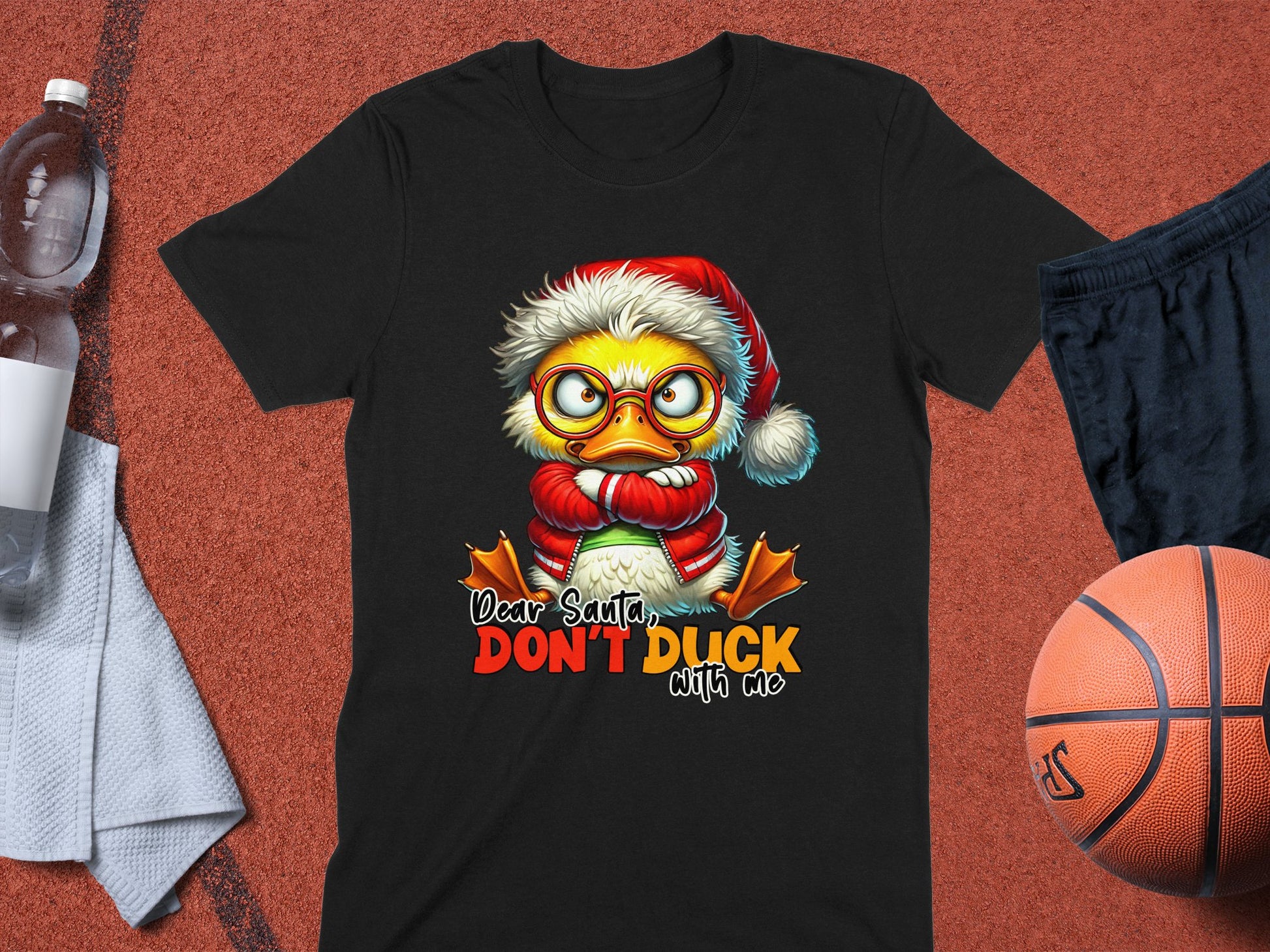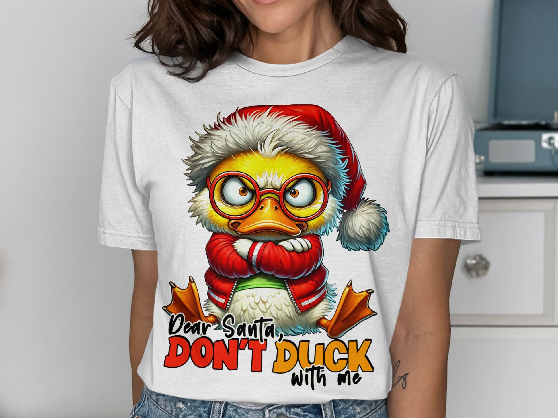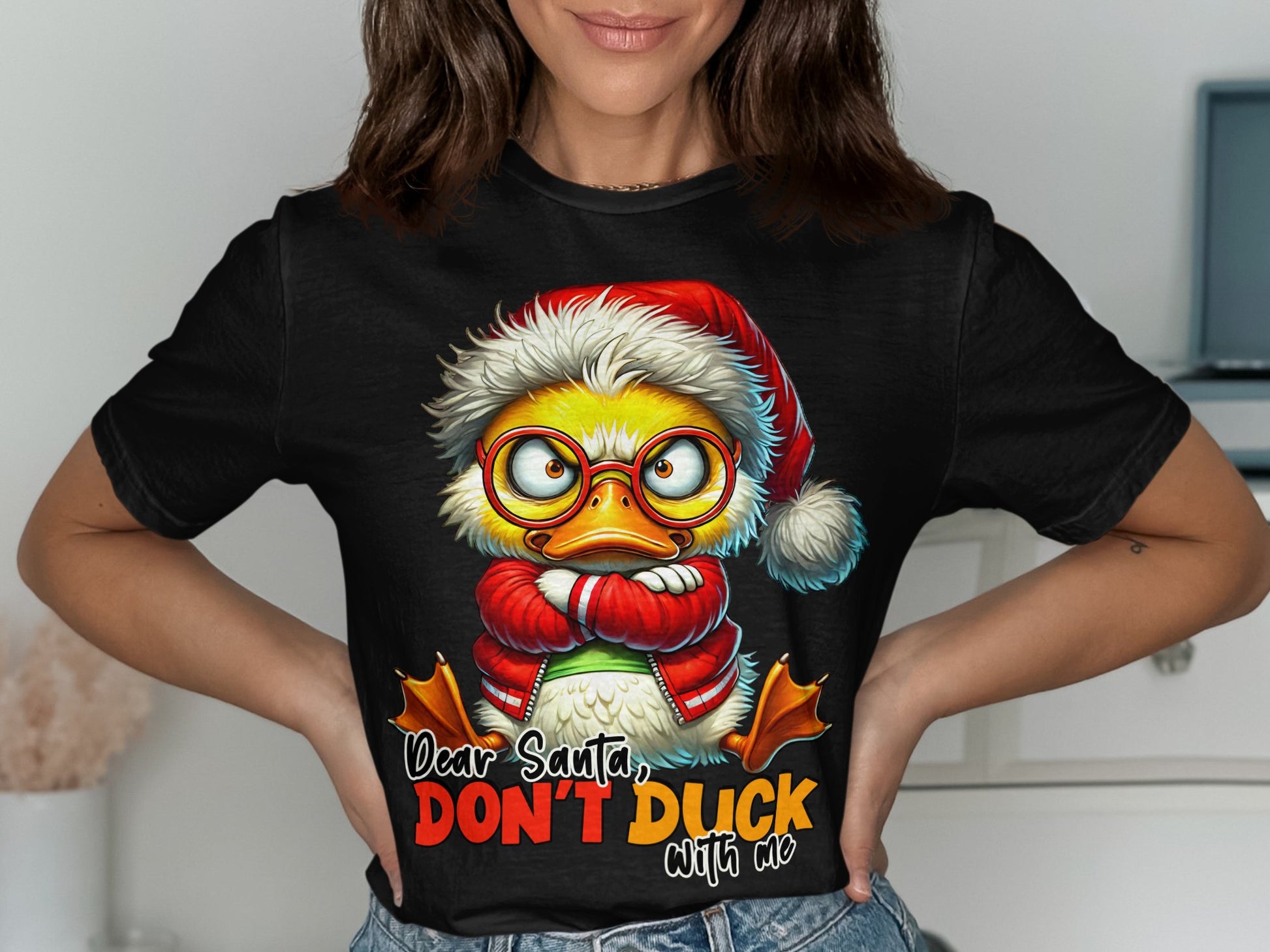 Get ready for the holidays with this hilarious and cute Christmas-themed t-shirt! Featuring a grumpy duck in a Santa hat and the playful message "Dear Santa, Don't Duck With Me," this shirt is perfect for adding some humor to your festive wardrobe. Made from soft, high-quality material, this tee is comfortable and durable, making it a great gift for friends and family. Embrace the holiday spirit and stand out at your next Christmas party with this fun and whimsical design!