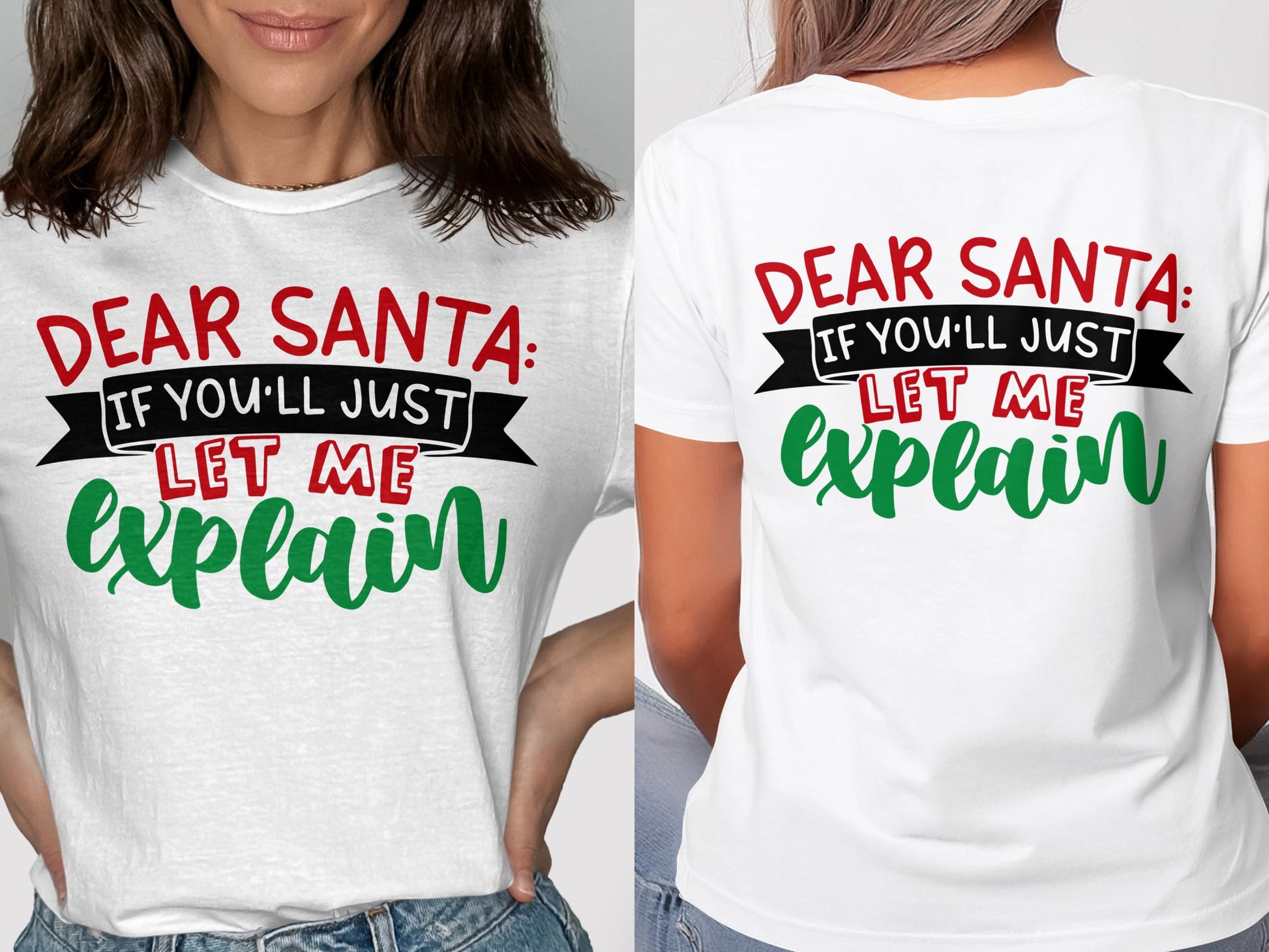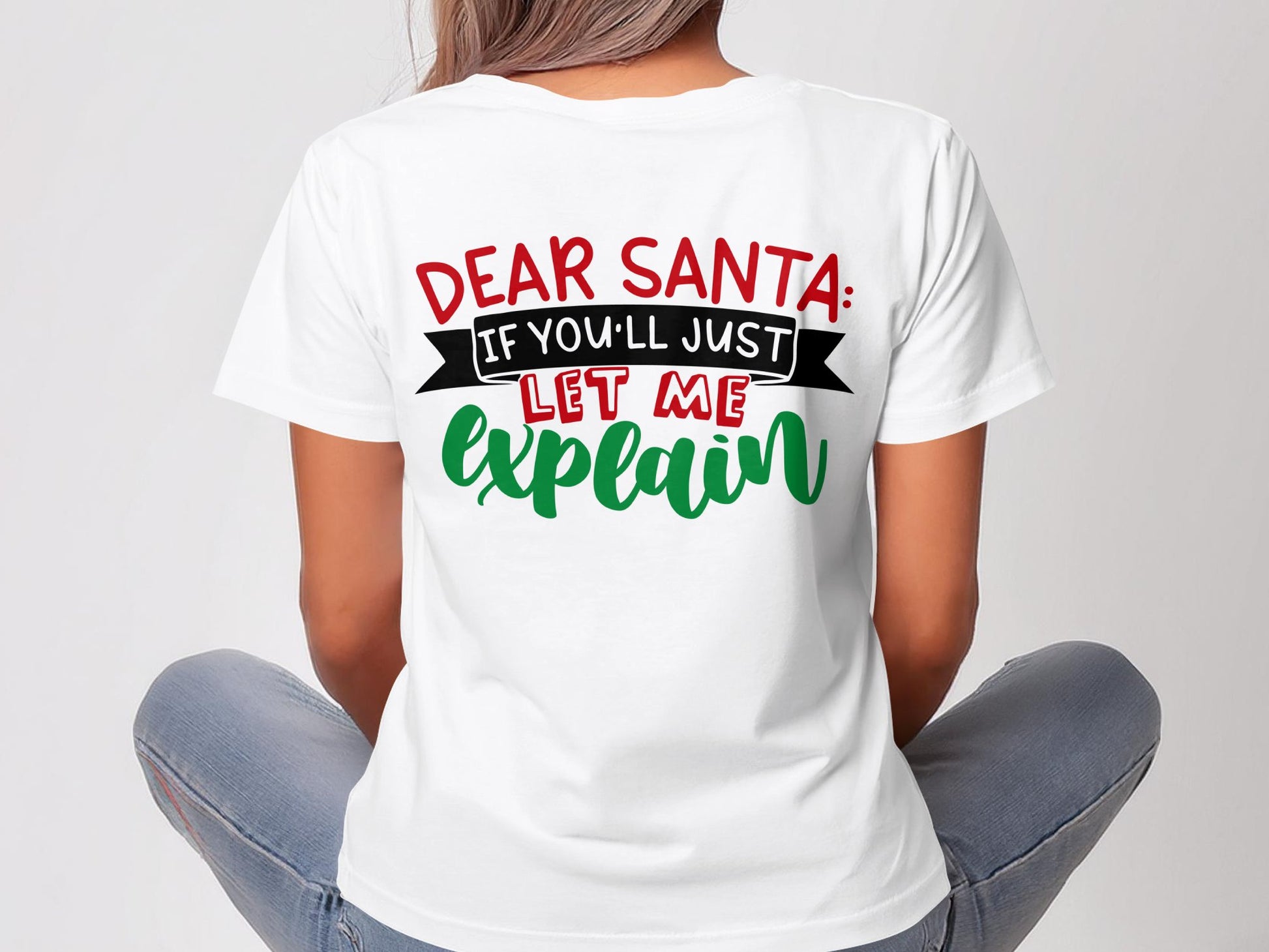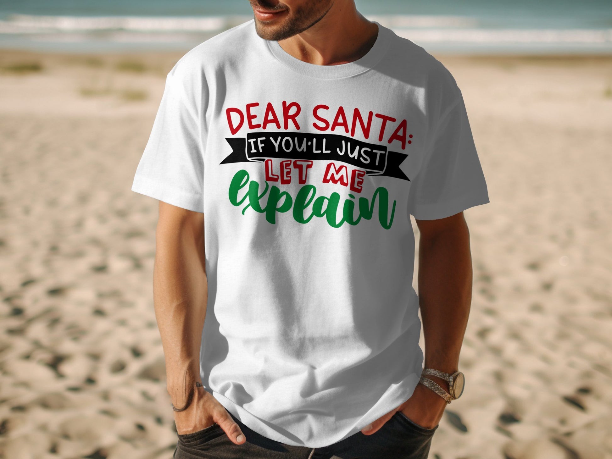 Add a touch of humor to your holiday wardrobe with this festive "Dear Santa: If You'll Just Let Me Explain" T-shirt. Perfect for Christmas gatherings, office parties, or just spreading holiday cheer. Made with soft, comfortable fabric, this unisex tee is sure to become a seasonal favorite. Celebrate the holidays in style and make everyone smile with this witty design. Available in various sizes, it's an excellent gift for friends and family who love to have fun during the festive season.