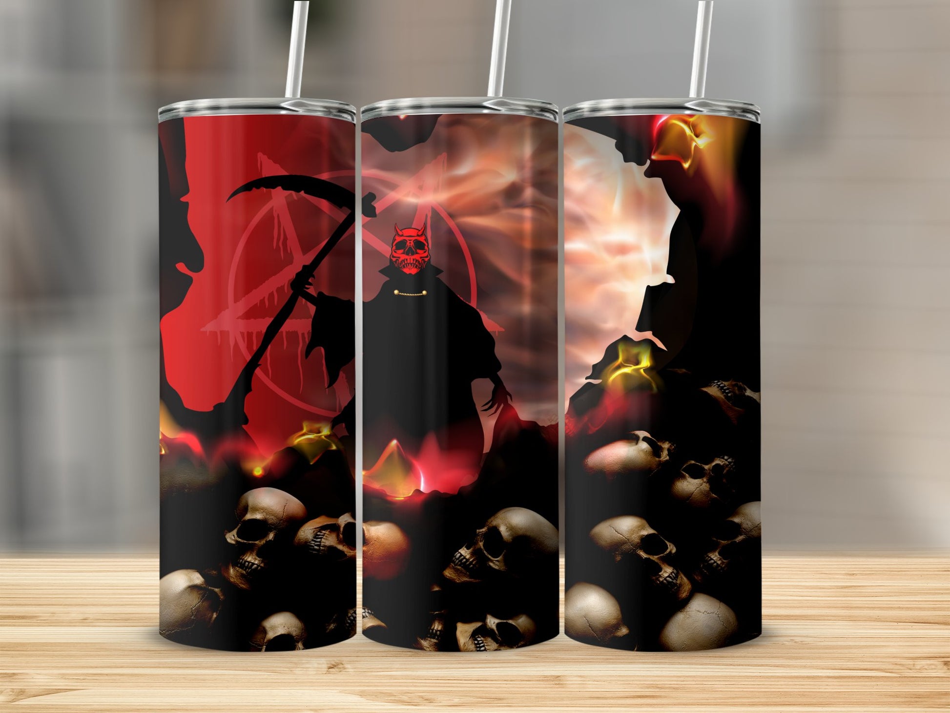 This Grim Reaper tumbler features a chilling design perfect for Halloween and horror enthusiasts. With its spooky skulls and reaper theme, this tumbler adds a gothic touch to your drinkware collection. Ideal for those who love horror aesthetics and want a unique, macabre cup to show off.