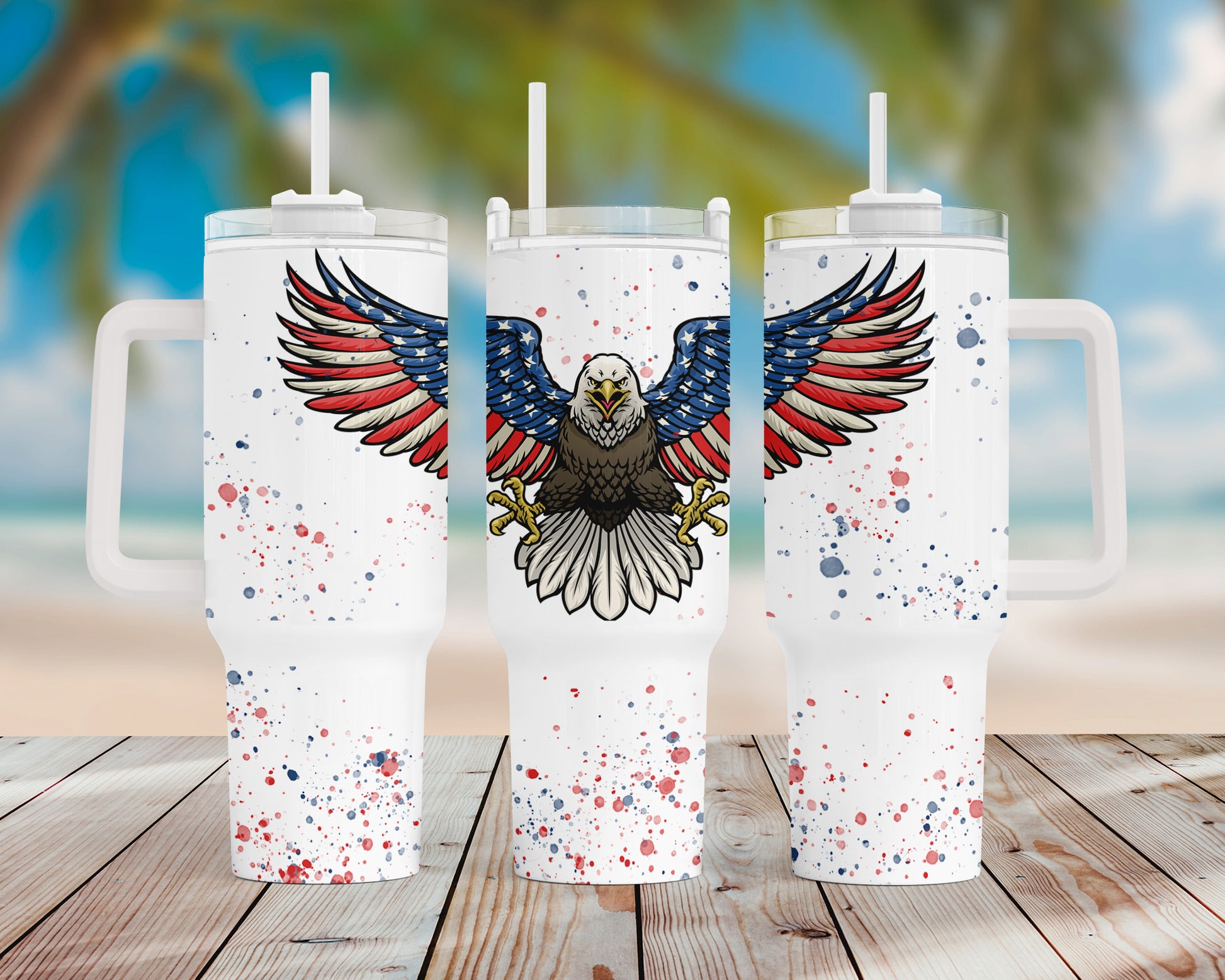 This 40oz Double Wall Stainless Steel Vacuum Tumbler With Handle is the perfect companion to take with you on any outdoor adventures. It can hold both hot and cold beverages, has a matching lid with three positions, and comes with a 12” straw and a 3.5” wide handle opening. It is 9.5” long and fits car cup holders. Plus, its premium drawing of an American Flag will make sure you stand out in a crowd. Don't miss out on this unique and stylish tumbler!