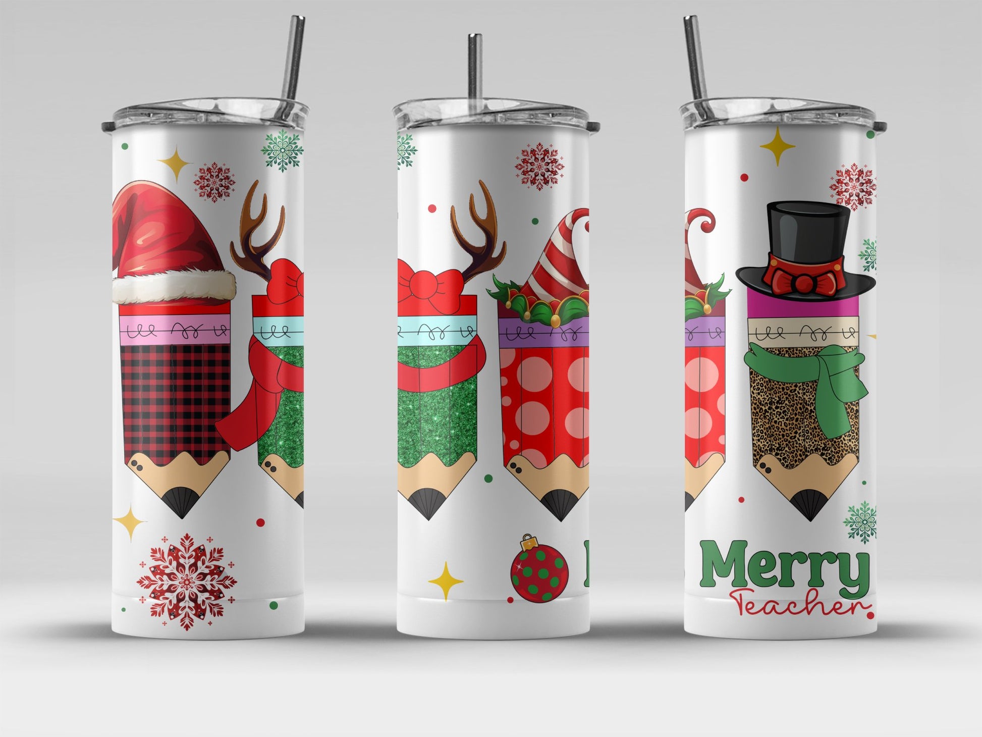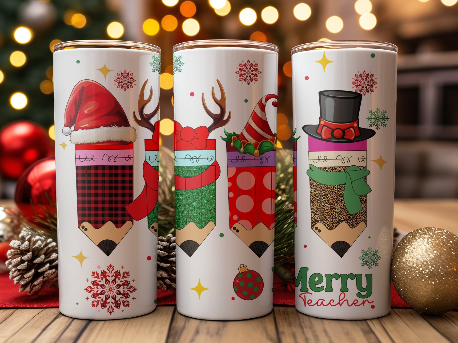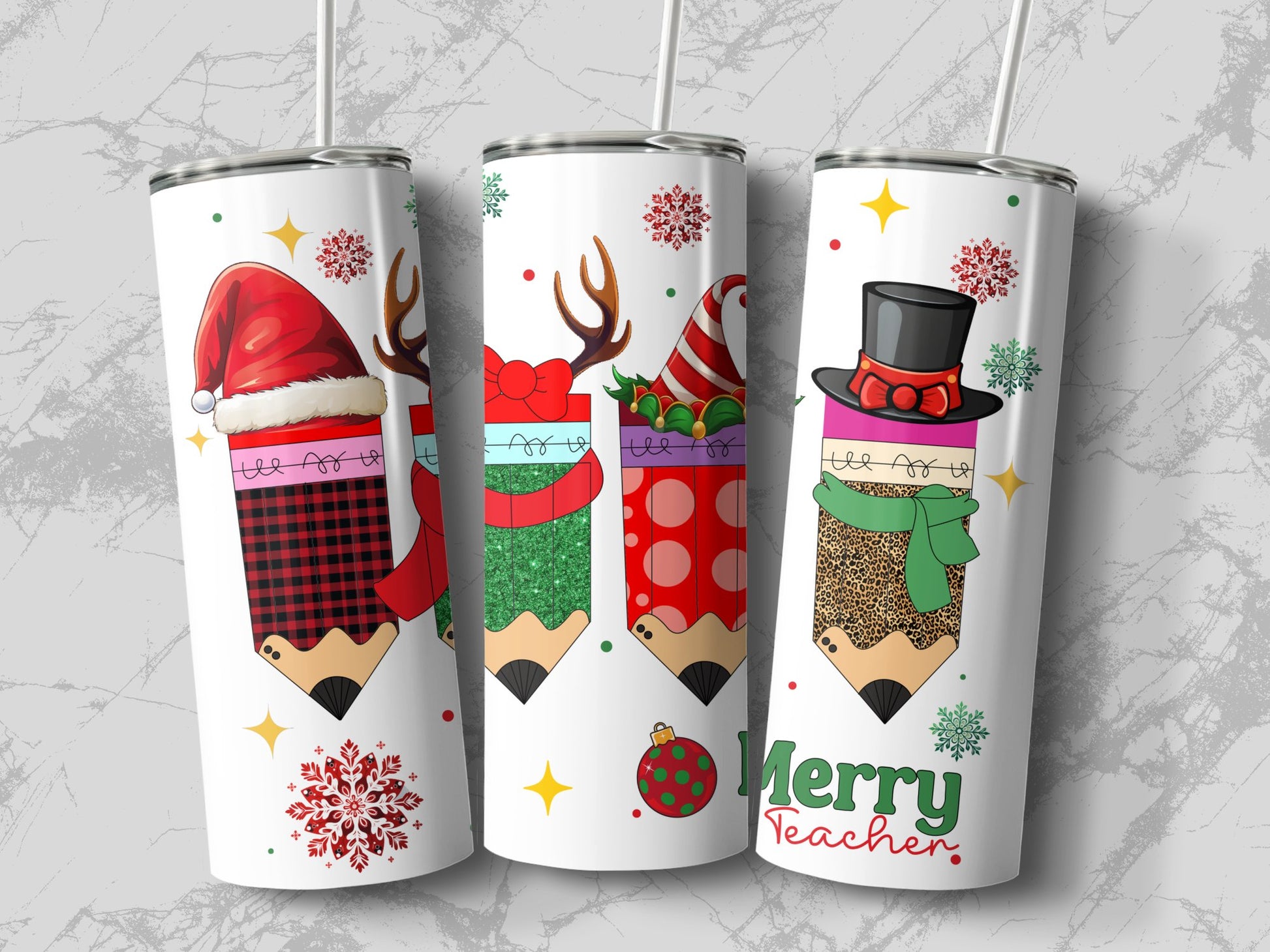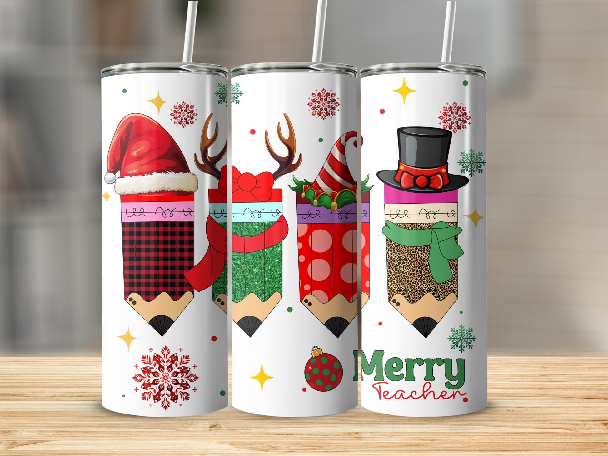Celebrate the holiday season with our Merry Teacher Tumblers! This festive design features four pencils dressed in adorable Christmas attire, including a Santa hat, reindeer antlers, elf hat, and a top hat. Perfect for teachers who love to spread holiday cheer, this tumbler is both fun and functional. Made from durable materials, it keeps your drinks hot or cold for hours. A great gift idea for your favorite teacher or a festive addition to your own drinkware collection.