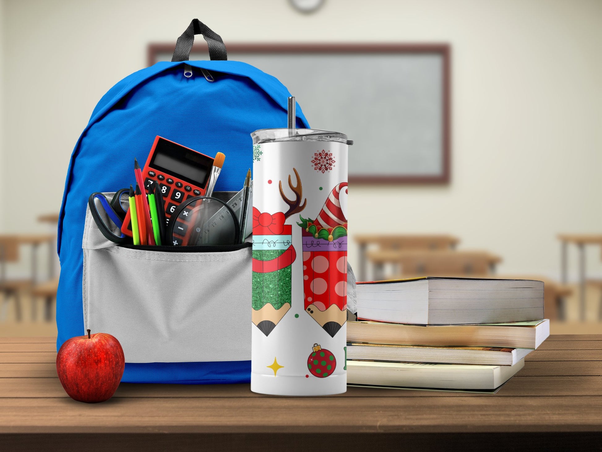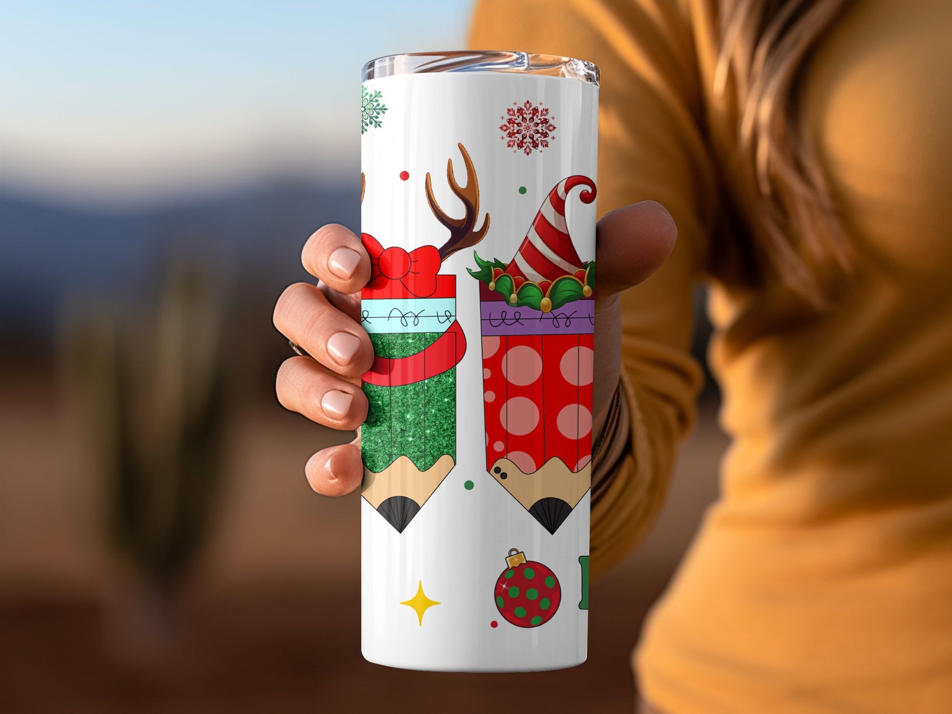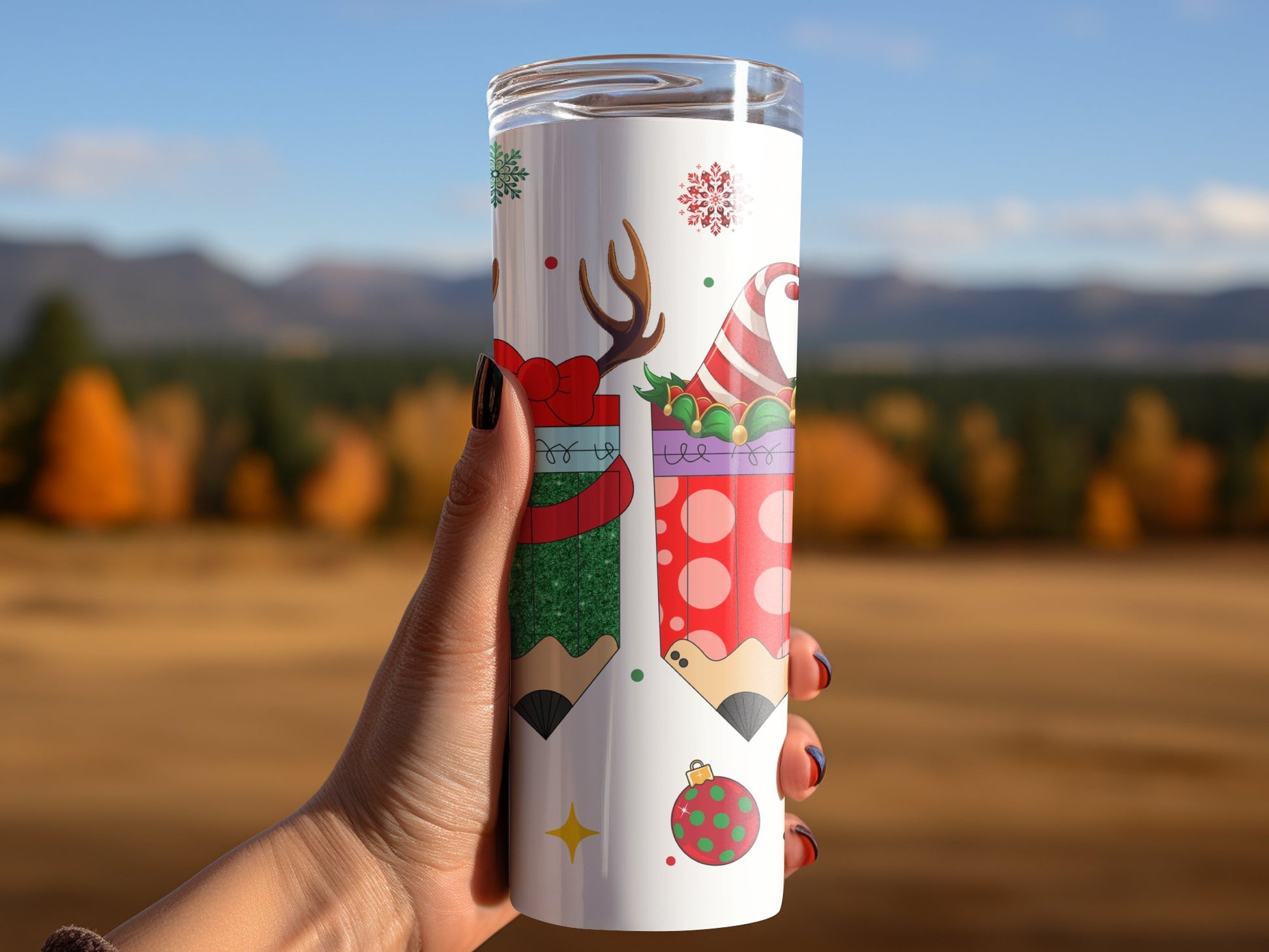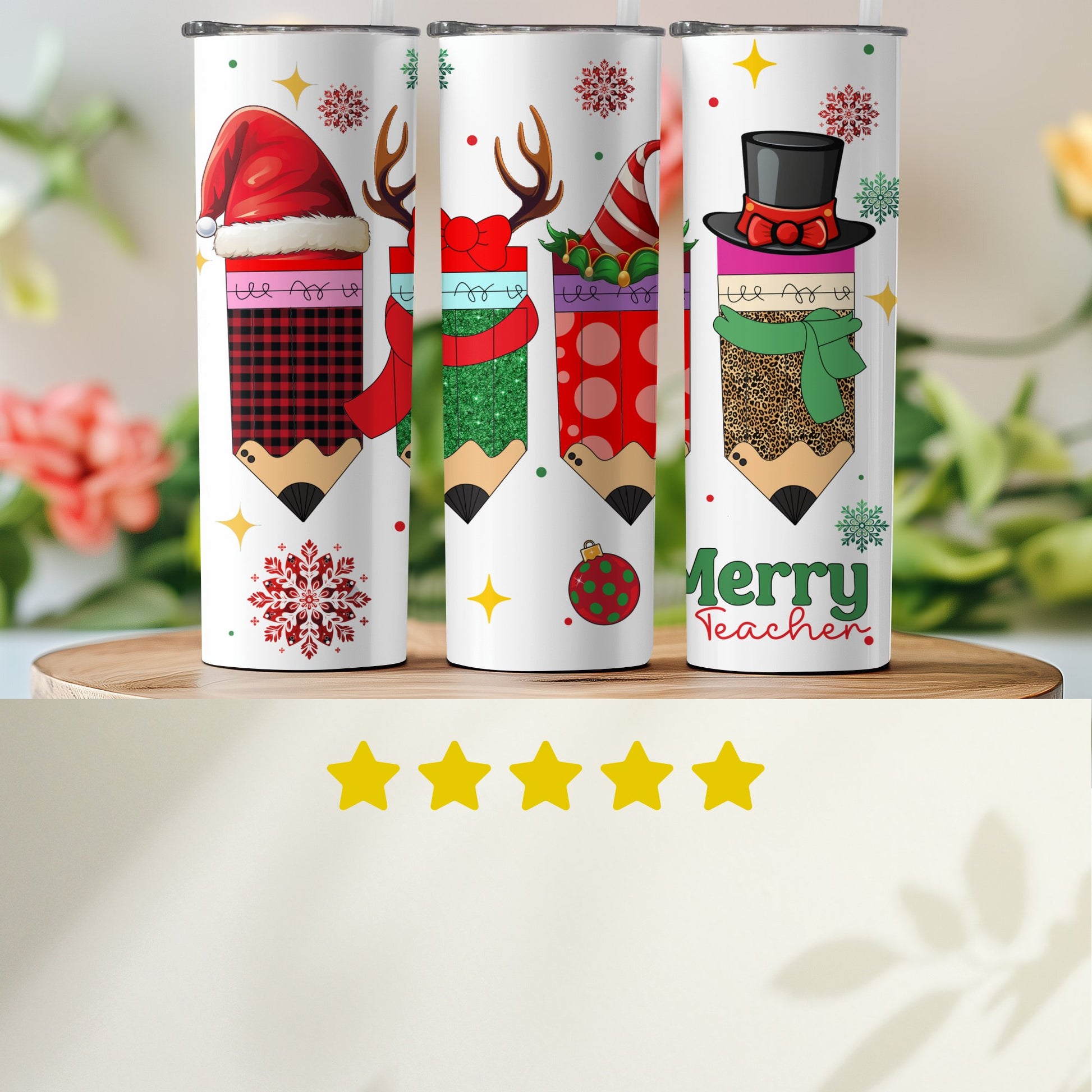 Celebrate the holiday season with our Merry Teacher Tumblers! This festive design features four pencils dressed in adorable Christmas attire, including a Santa hat, reindeer antlers, elf hat, and a top hat. Perfect for teachers who love to spread holiday cheer, this tumbler is both fun and functional. Made from durable materials, it keeps your drinks hot or cold for hours. A great gift idea for your favorite teacher or a festive addition to your own drinkware collection.