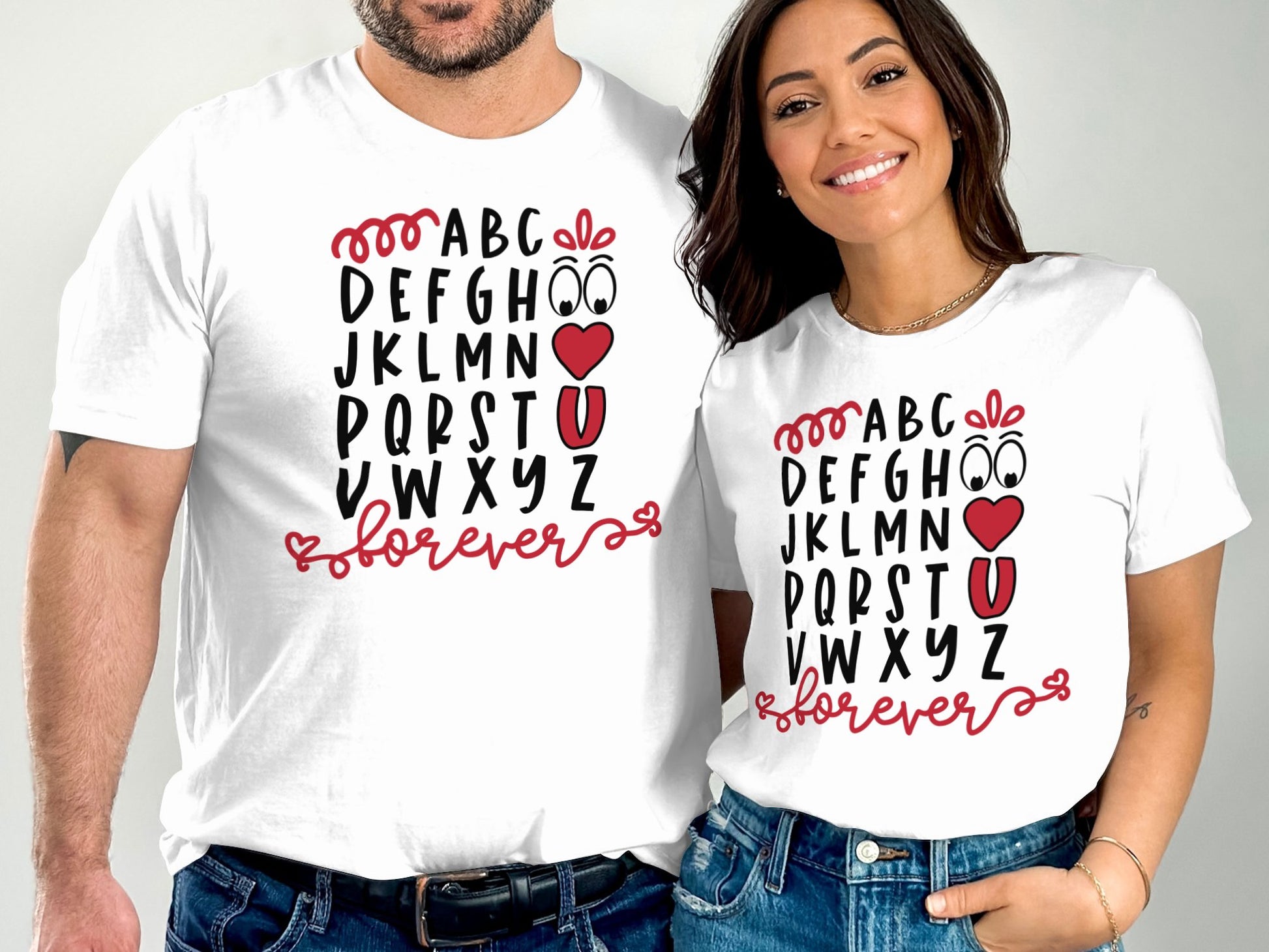 This adorable alphabet-themed T-shirt features a playful design with letters from A to Z and a charming twist. The letters "I" and "U" are replaced with a cute heart and a pair of eyes, creating the phrase "I ♥ U" in a unique way. The word "forever" is elegantly written underneath, making this T-shirt a perfect gift for loved ones. Made from high-quality, comfortable fabric, this shirt is ideal for casual wear. Show your love and style with this fun and delightful T-shirt!