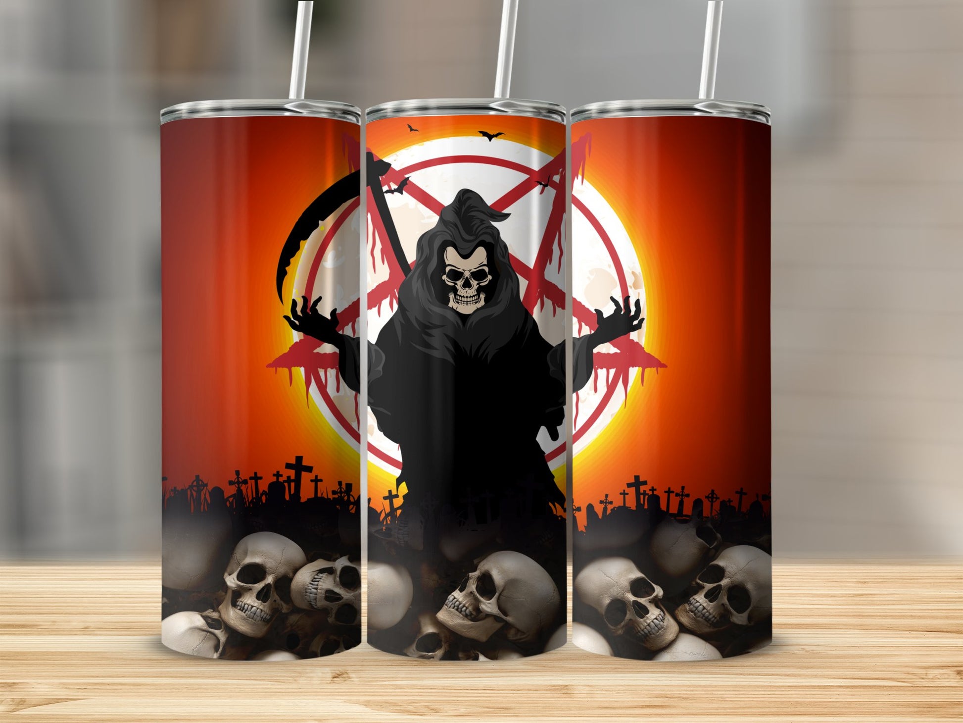 Elevate your drinkware with our Grim Reaper Tumbler. This Gothic Skull Design is perfect for Halloween and fans of spooky, dark art. Made to keep your beverages at the ideal temperature, this tumbler combines functionality with a hauntingly beautiful design. Whether you're at home or on the go, this Horror Theme Drinkware is sure to make a statement.
