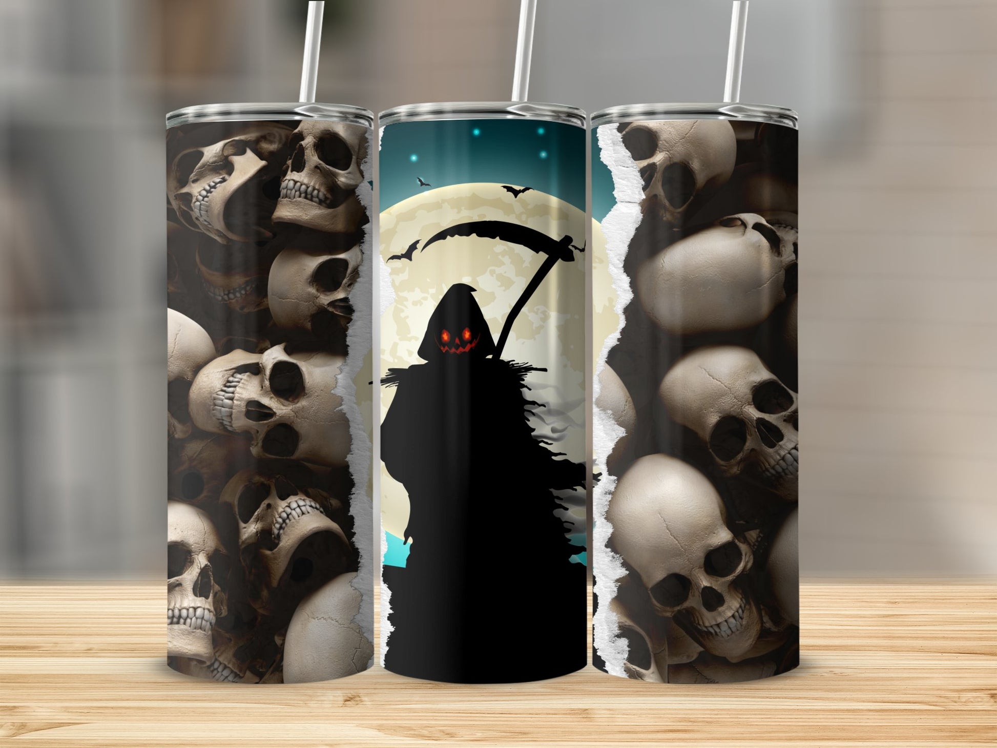 This Halloween Grim Reaper Tumbler features a haunting design with skulls and a reaper silhouette. Perfect for spooky season and Halloween parties, this tumbler is both creepy and fun. Ideal for keeping your drinks cold or hot for longer periods.