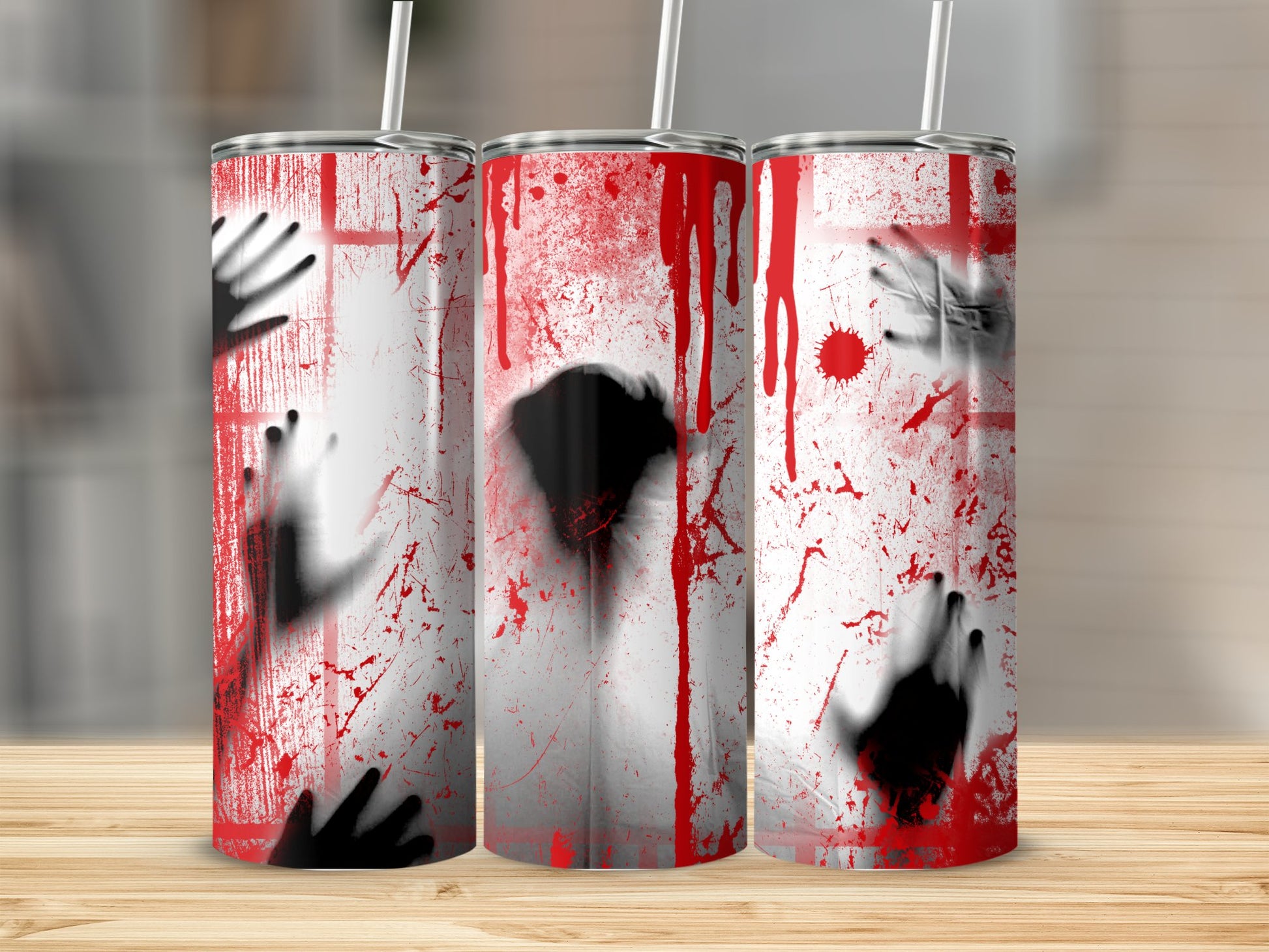 A striking horror-themed tumbler featuring eerie bloody handprints and a chilling silhouette. Perfect for Halloween parties or as a unique gift for horror fans, this gruesome design adds a macabre touch to your drinkware collection. The striking imagery makes it a standout piece sure to impress and spook your friends and guests. Get your horror tumbler today and bring a spooky vibe to your parties and gatherings.