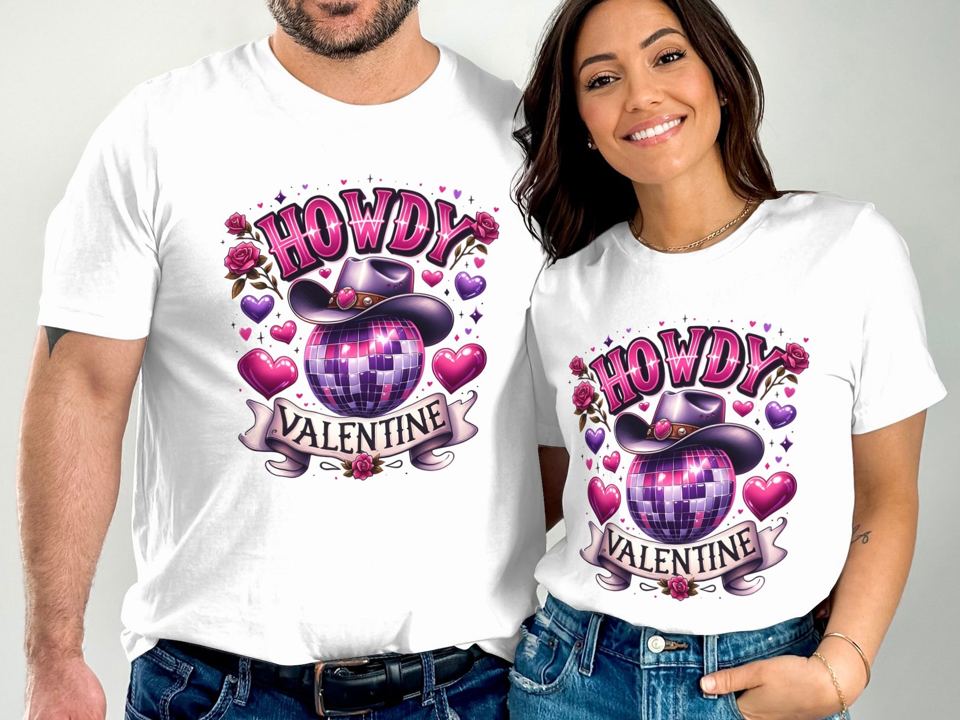 Step into a blend of country charm and disco vibes with our "Howdy Valentine" T-Shirt. This unique design features a stylish cowboy hat atop a glittering disco ball, surrounded by vibrant hearts and roses. Perfect for Valentine's Day or any occasion that calls for a touch of romance and fun. Made from soft, comfortable fabric, this tee is a great gift for loved ones or a delightful addition to your wardrobe. Embrace the spirit of love and dance with this eye-catching piece!