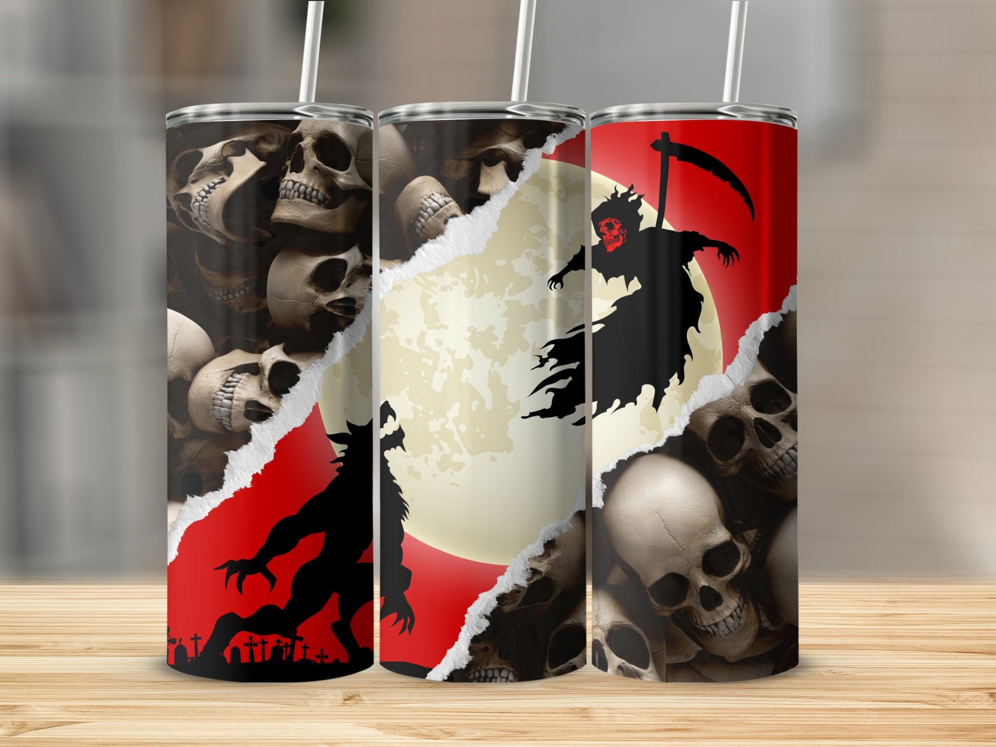 This eye-catching Halloween Skull Tumbler features a striking Grim Reaper moon design with a werewolf and spooky red background. Perfect for fans of horror and gothic themes, this tumbler makes a unique gift idea for any occasion. Enjoy your favorite beverages in style with this creepy, high-quality drinkware that is sure to stand out.
