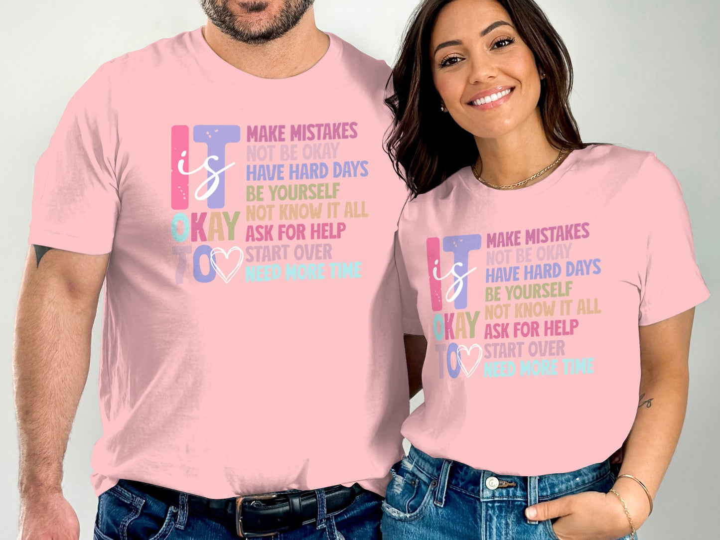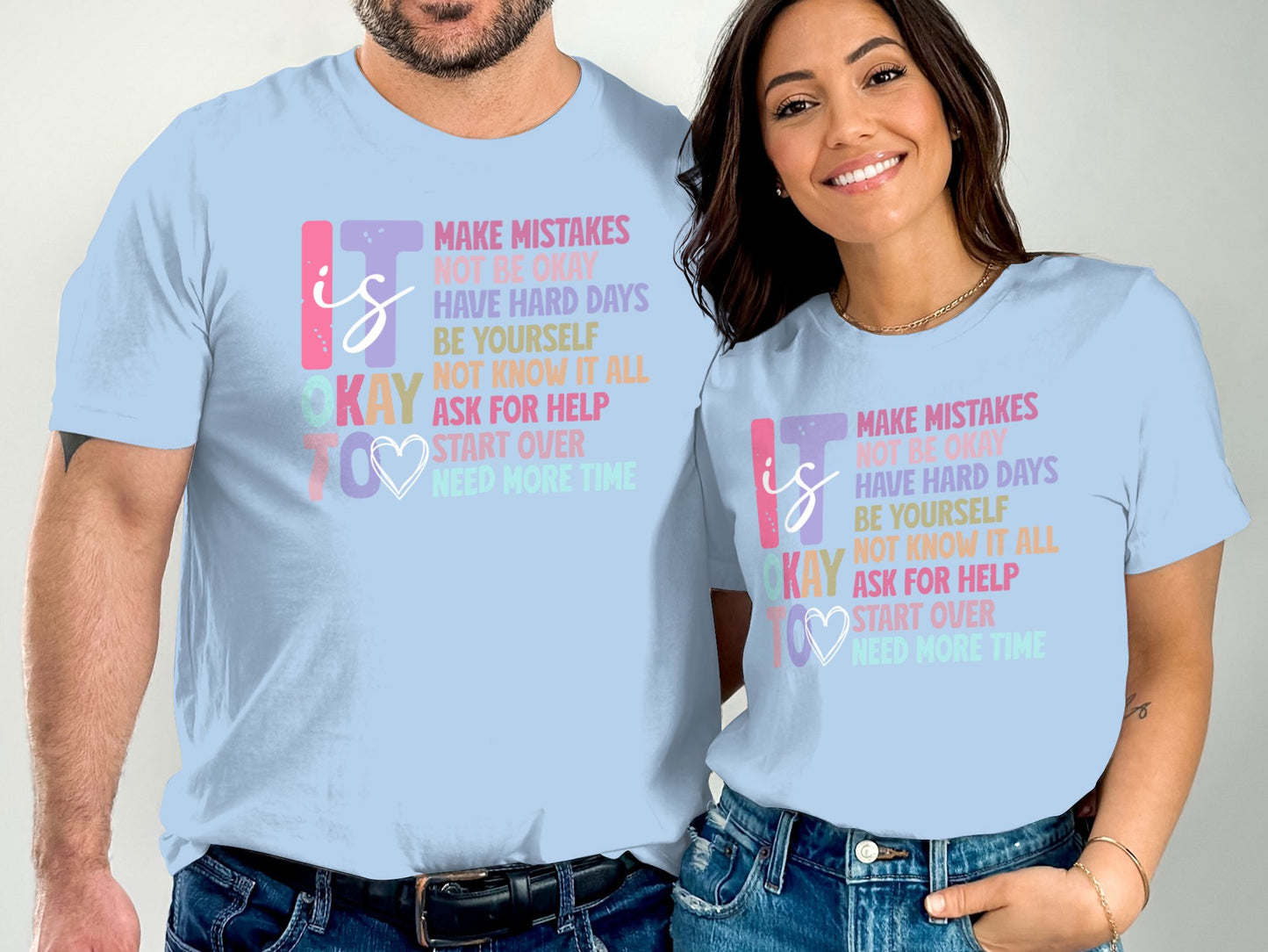 This inspirational t-shirt features a colorful and reassuring message. The text "It’s Okay to" is prominently displayed, followed by various comforting phrases like "make mistakes," "be yourself," and "need more time." The playful, multicolored design adds a touch of positivity and encouragement to your wardrobe, making it perfect for casual wear, self-love, and as a motivational gift for friends or family. Comfortable and stylish, this t-shirt is a great reminder to be kind to yourself every day.