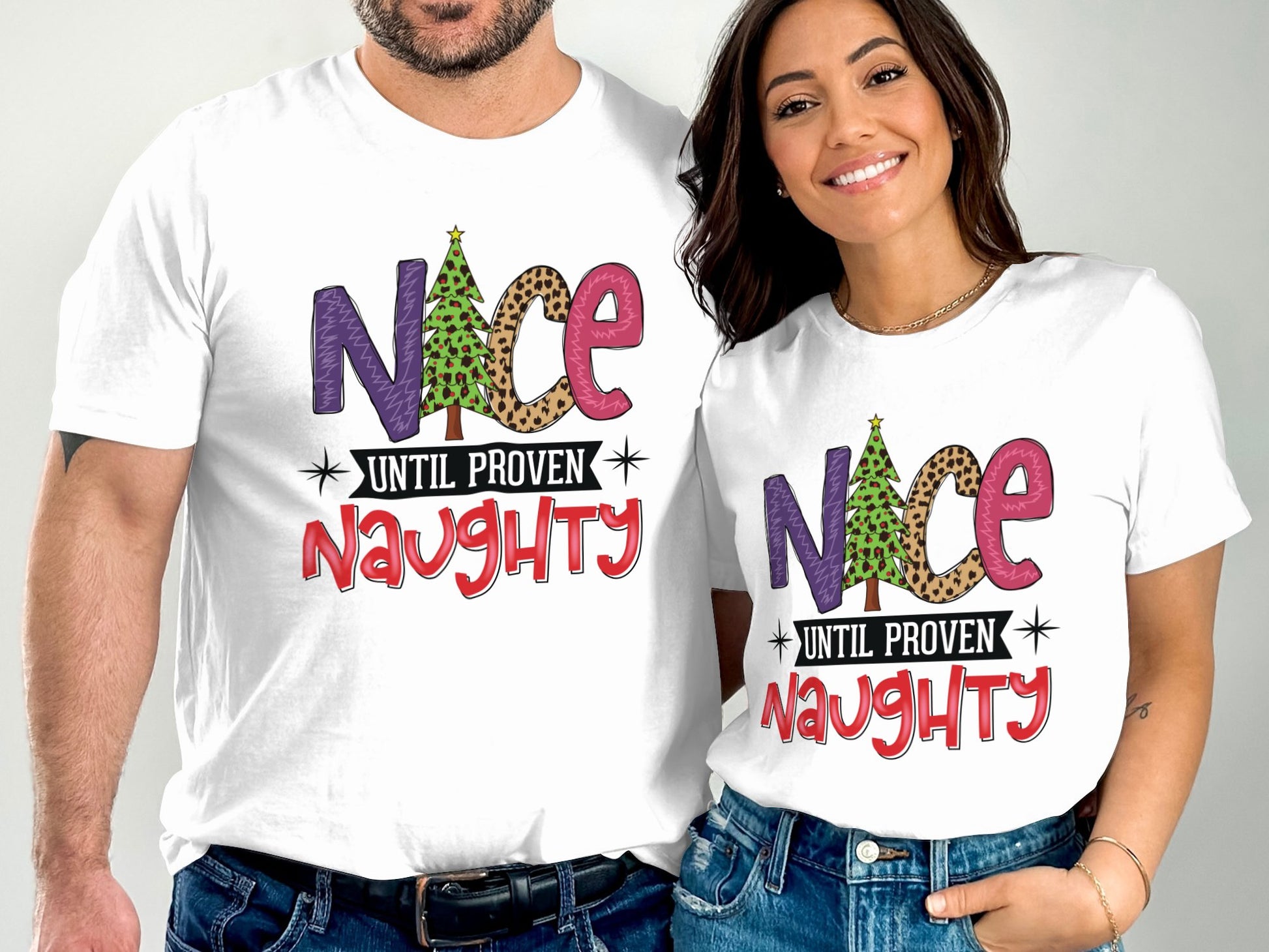 Embrace the holiday spirit with this playful and festive graphic T-shirt that reads "Nice Until Proven Naughty." Featuring a fun design with a Christmas tree and eye-catching text, this shirt is perfect for adding a touch of humor and cheer to your holiday wardrobe. Made from high-quality materials, it offers comfort and style for all your festive celebrations. Ideal for holiday parties, family gatherings, or as a funny Christmas gift.