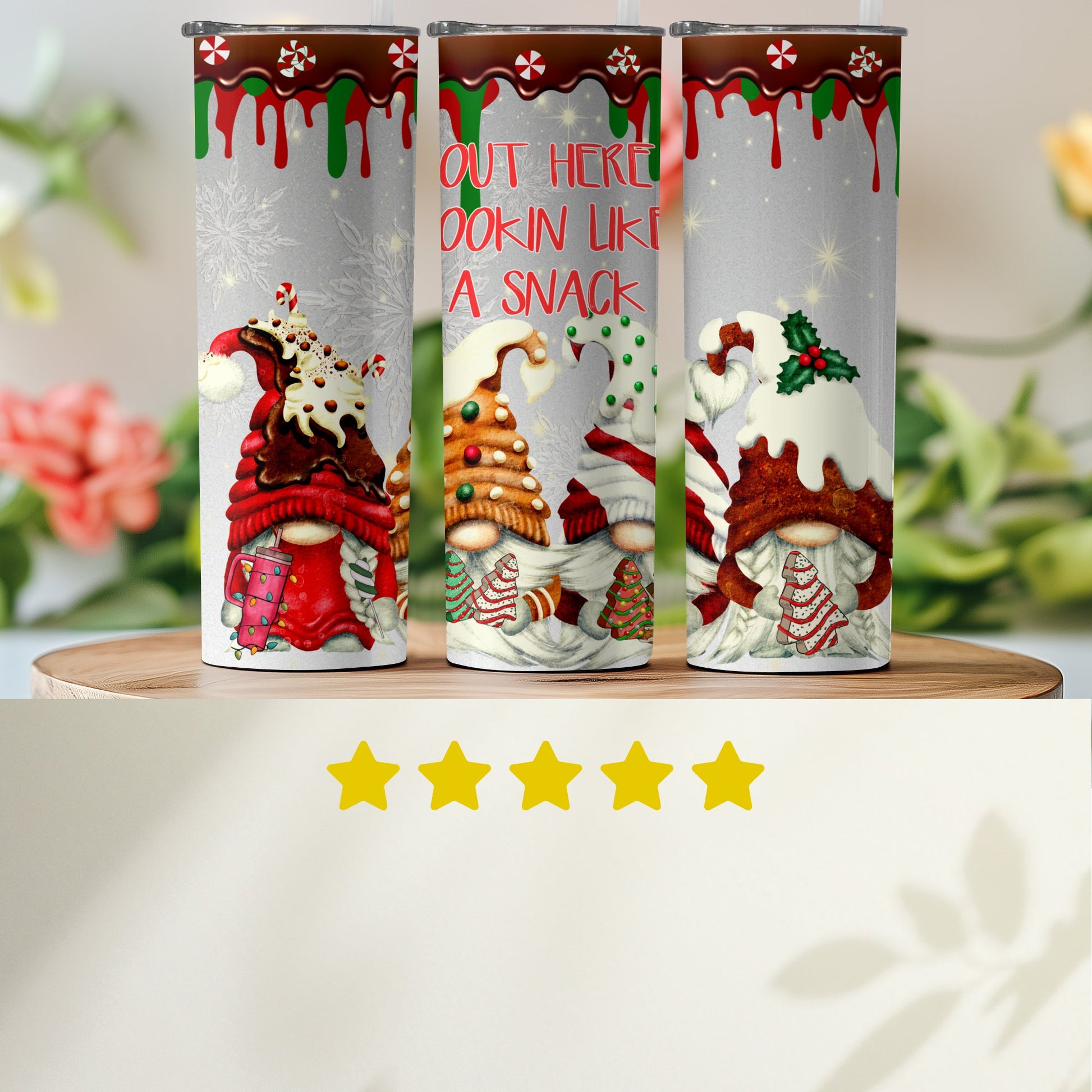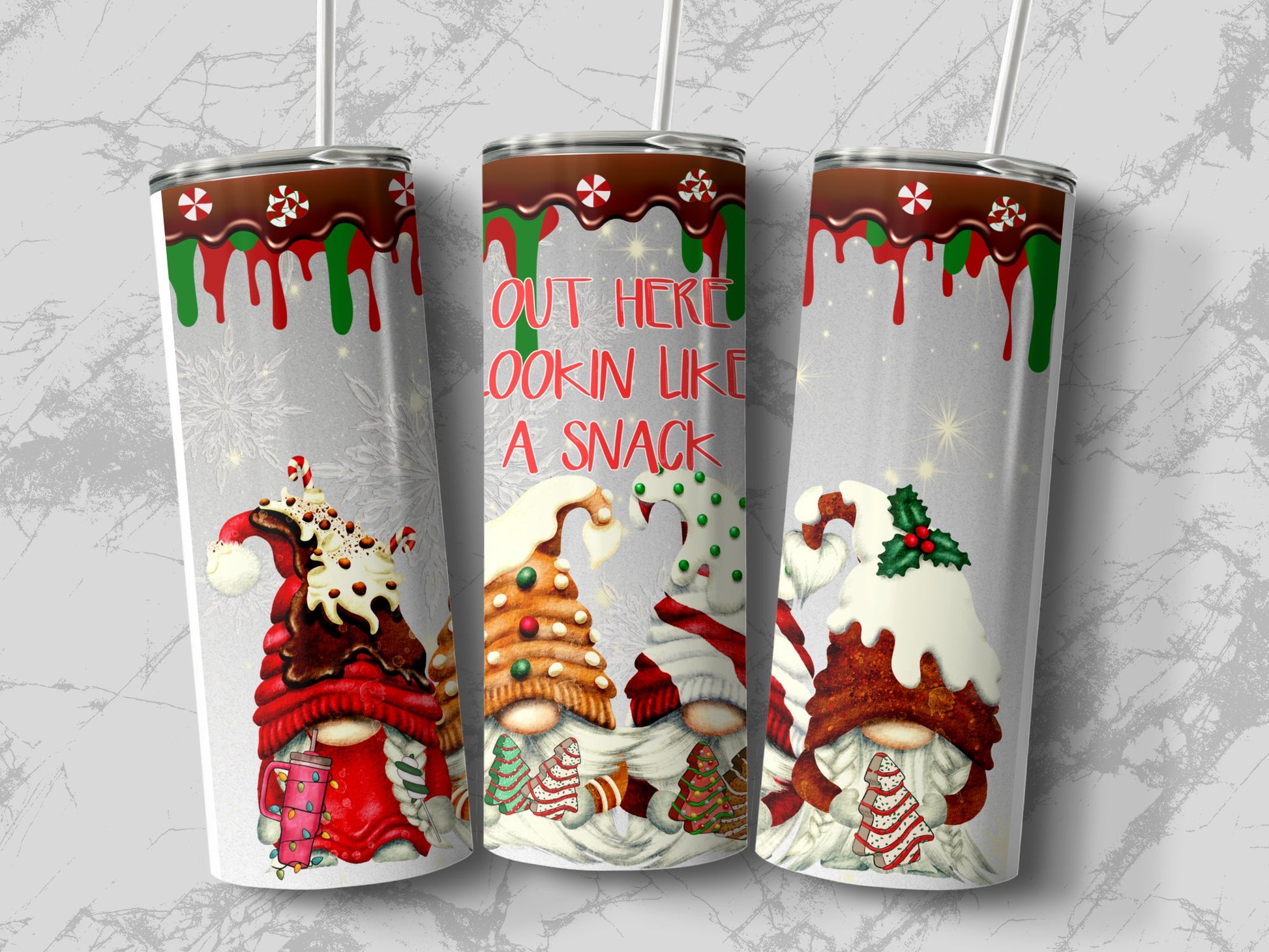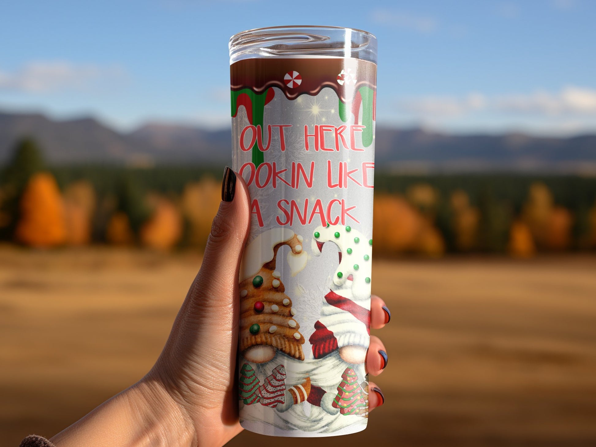 Add a touch of whimsy and holiday cheer to your daily hydration with our festive tumbler! Featuring adorable gnomes dressed in Christmas-themed outfits and sporting deliciously sweet toppings, this tumbler will keep you hydrated while making you smile. The playful "Out Here Lookin Like A Snack" quote adds a fun twist to your drinkware collection. Perfect for gifting or treating yourself during the holiday season!