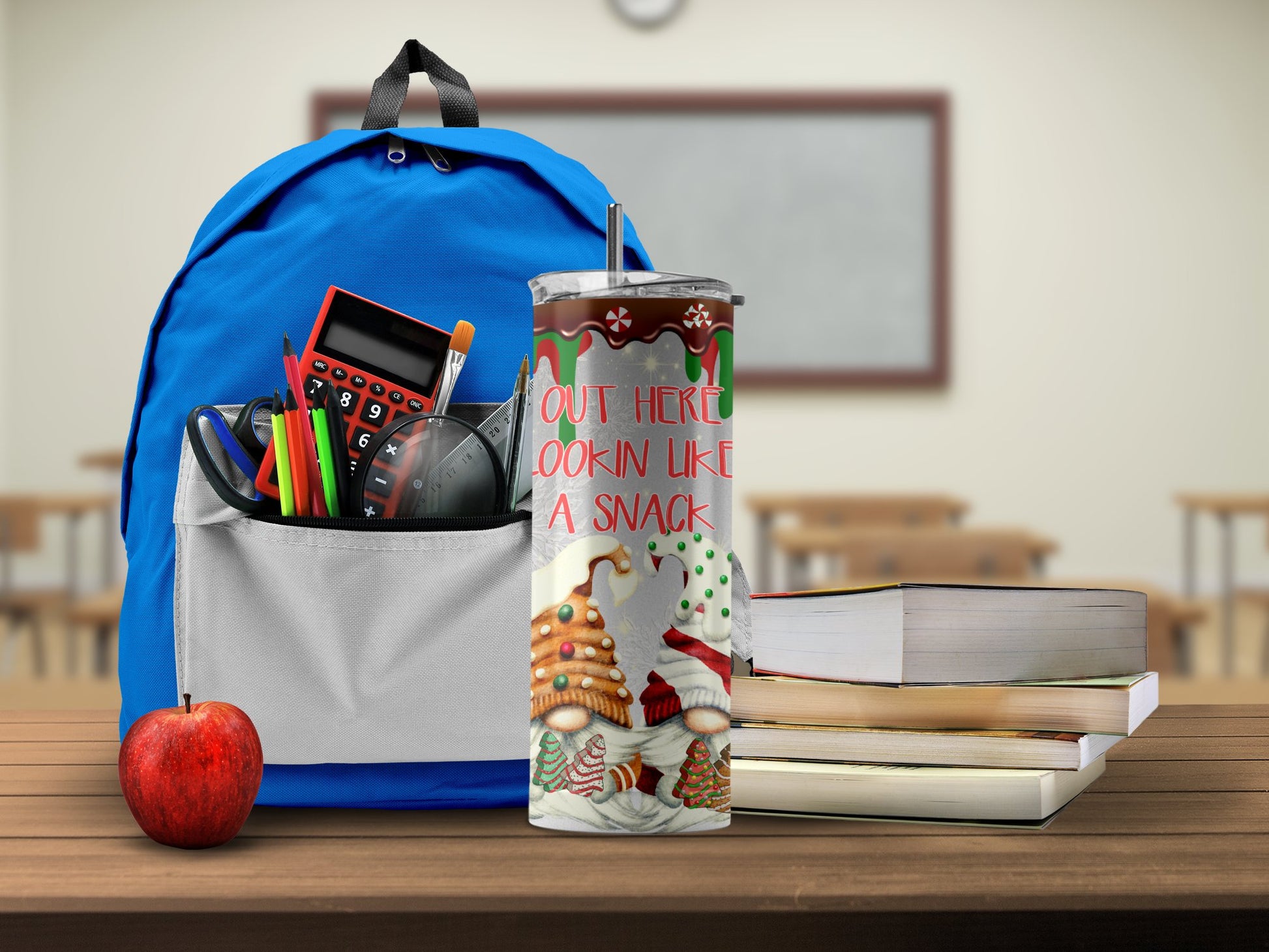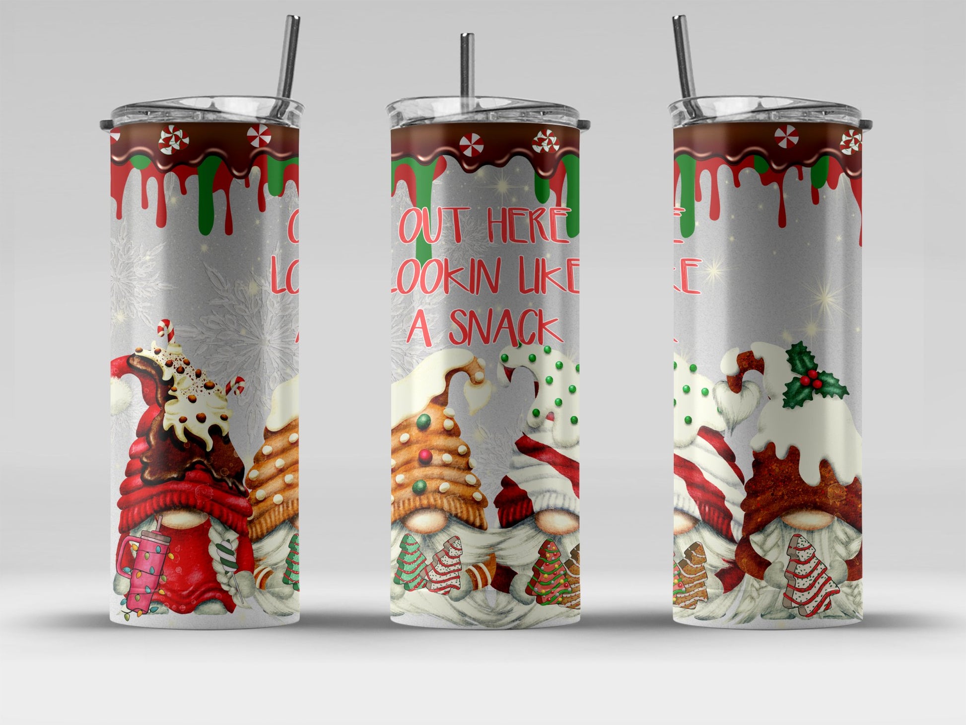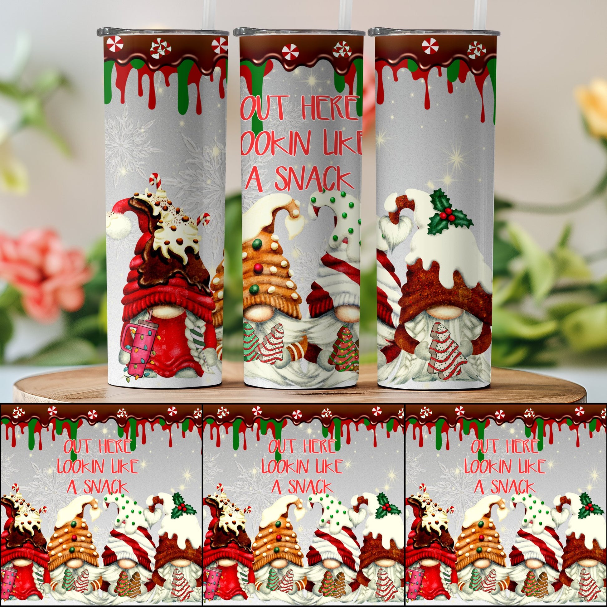 Add a touch of whimsy and holiday cheer to your daily hydration with our festive tumbler! Featuring adorable gnomes dressed in Christmas-themed outfits and sporting deliciously sweet toppings, this tumbler will keep you hydrated while making you smile. The playful "Out Here Lookin Like A Snack" quote adds a fun twist to your drinkware collection. Perfect for gifting or treating yourself during the holiday season!