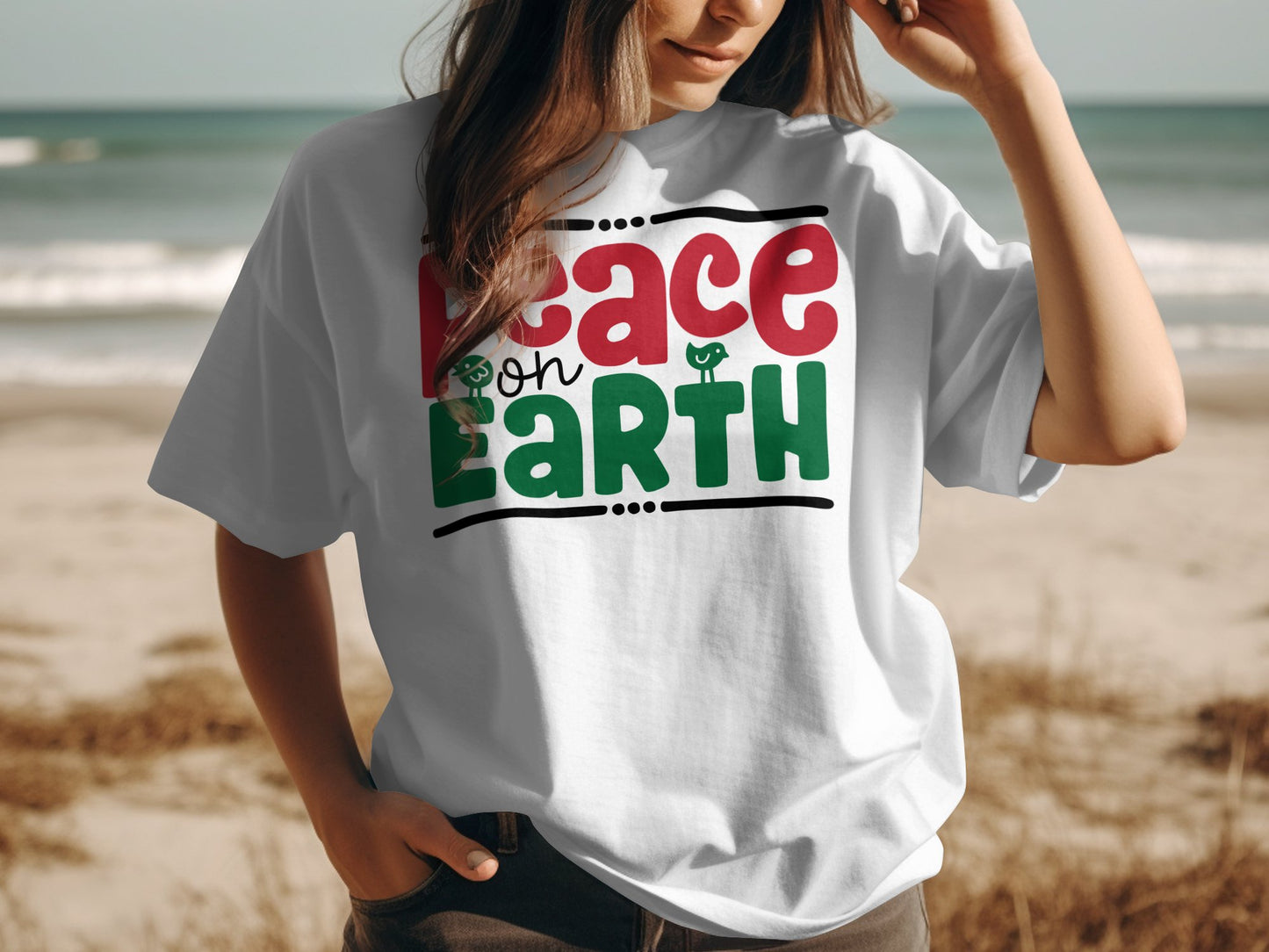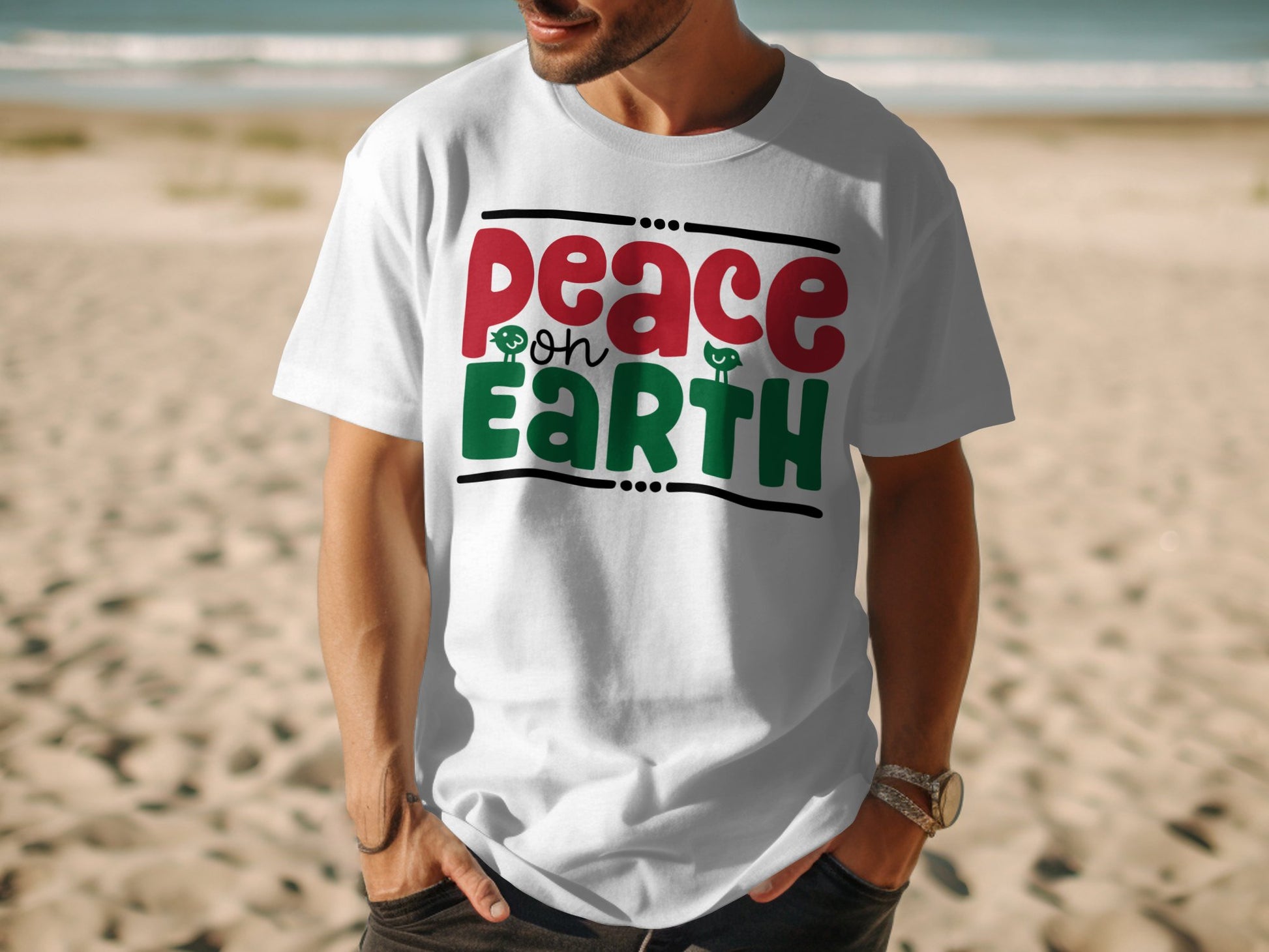 Celebrate the spirit of love and harmony with our "Peace on Earth" T-shirt. Made from comfortable, high-quality fabric, this tee features a vibrant design with bold red and green lettering and charming little birds. Perfect for spreading positive vibes and making a statement. Wear it to casual gatherings, holidays, or just because. Available in various sizes to fit all. Spread peace and joy with every wear!