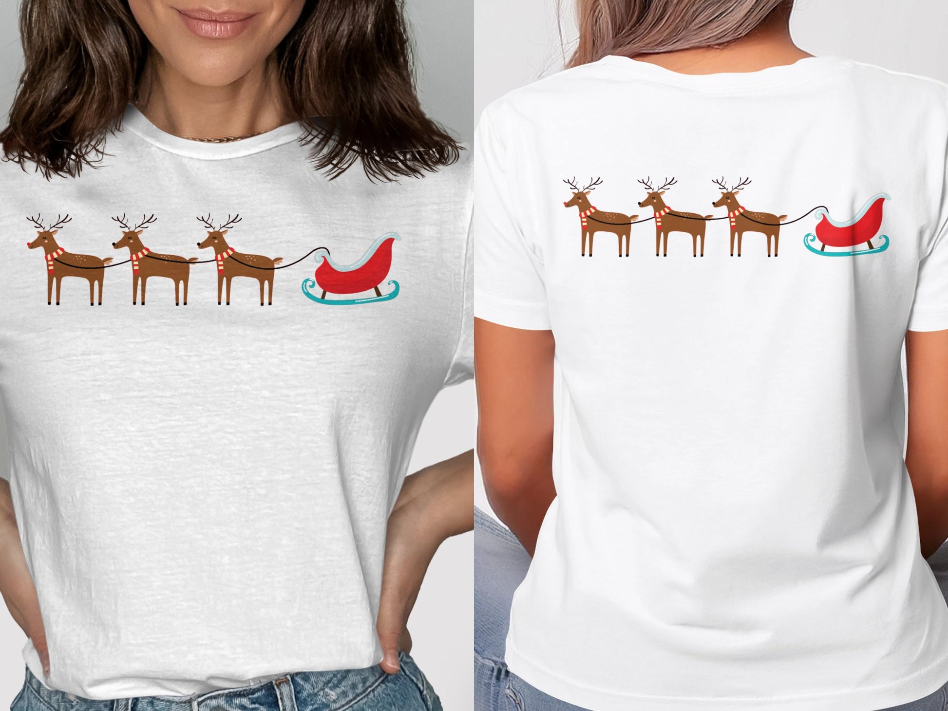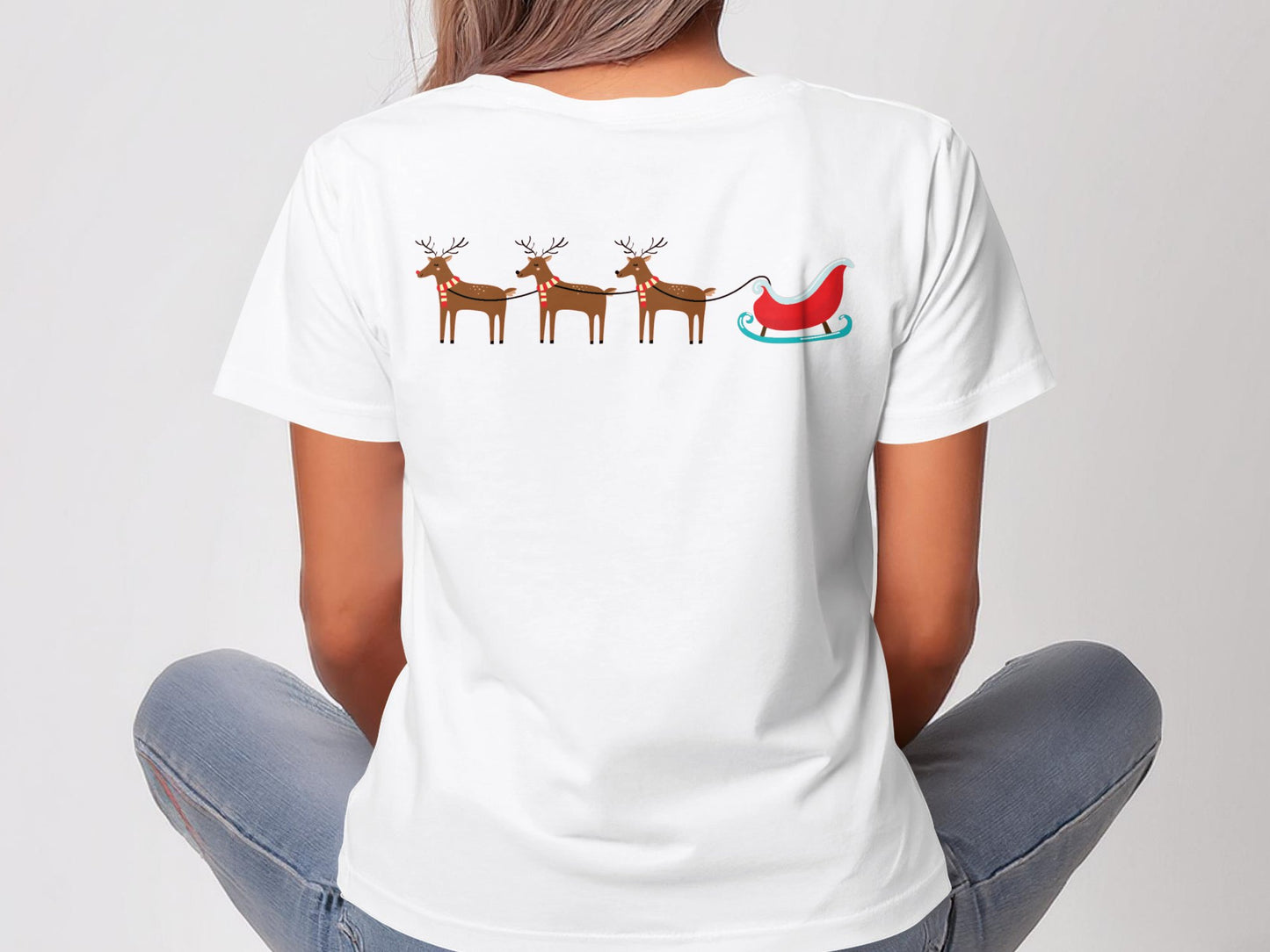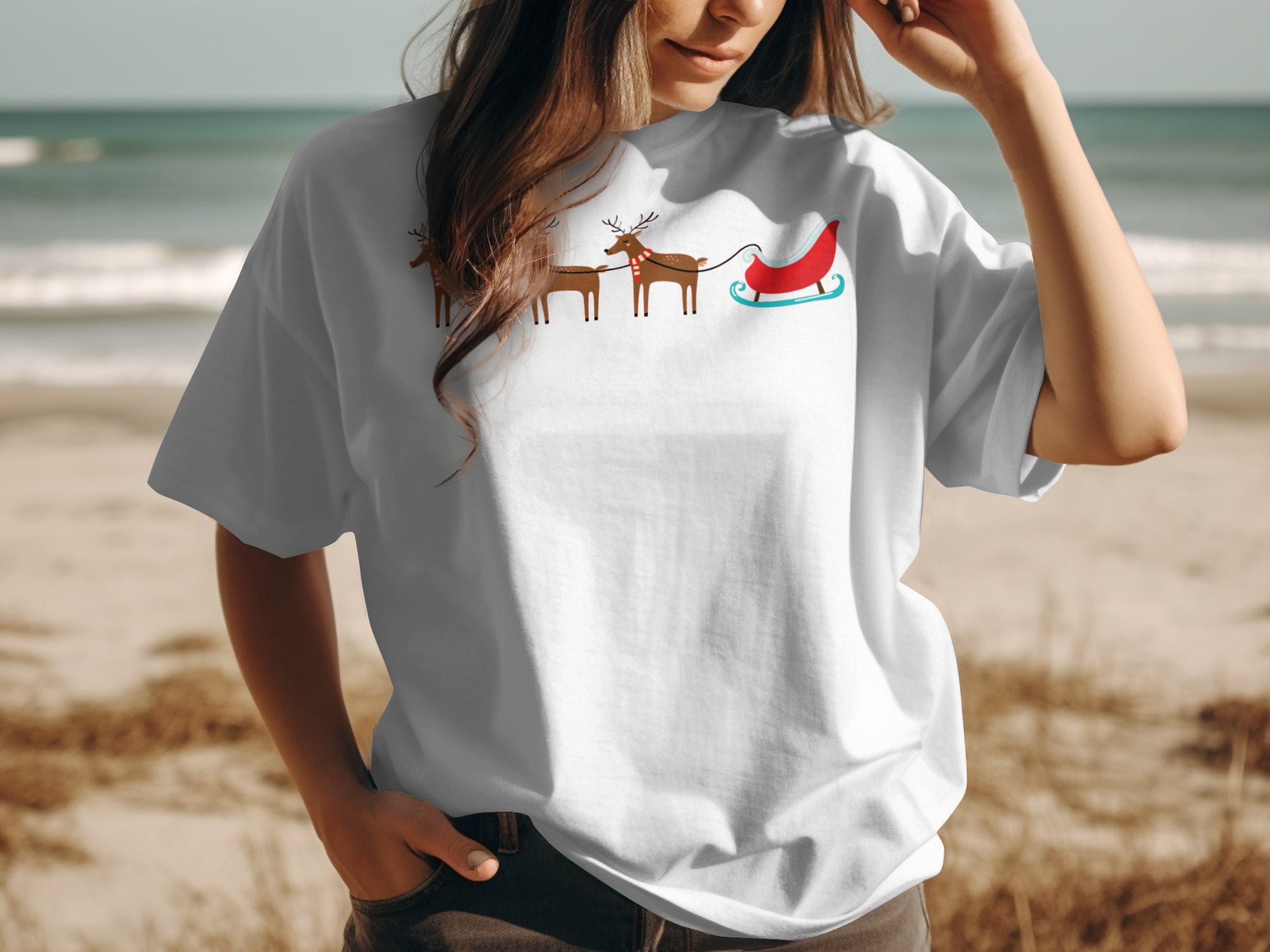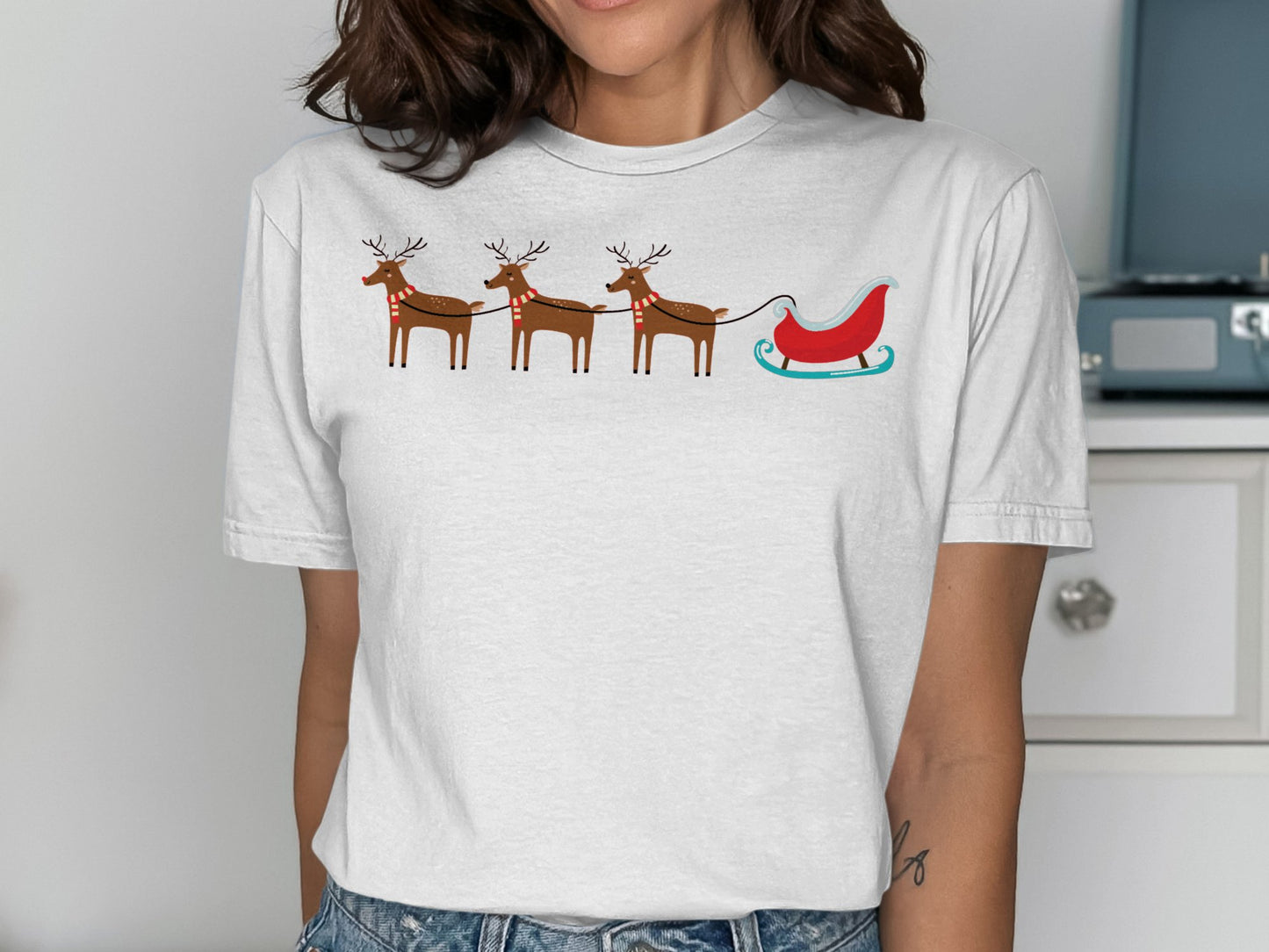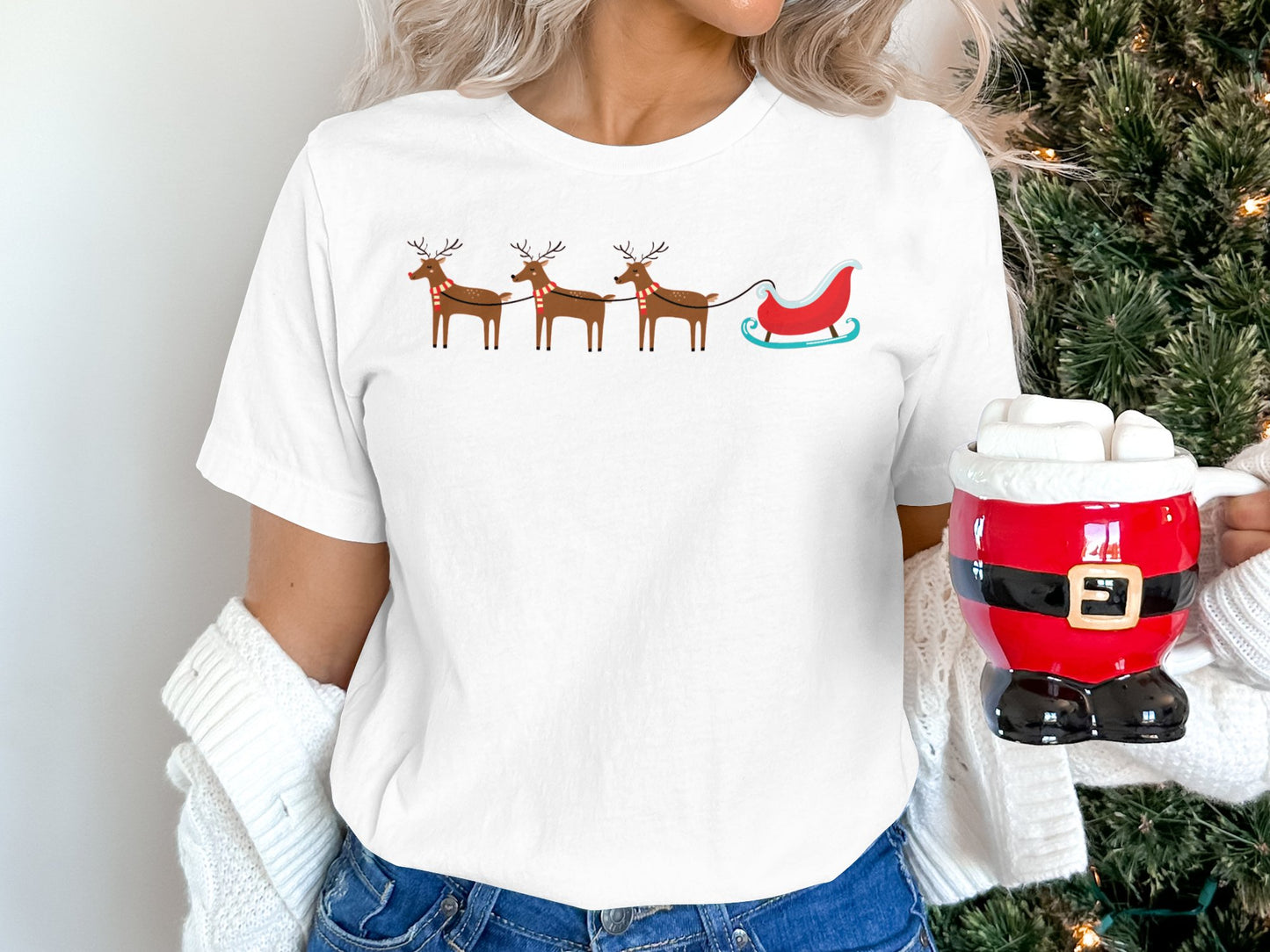 Celebrate the festive season with this charming Christmas T-shirt, featuring a delightful design of three reindeer pulling Santa's sleigh. Perfect for holiday gatherings, this shirt is made from soft, comfortable fabric, ensuring you stay cozy while spreading holiday cheer. Ideal for Christmas parties, family photos, or as a thoughtful gift for loved ones, this T-shirt captures the joyous spirit of the season with its cute and whimsical illustration. Available in various sizes, this holiday-themed shirt is sure to become a favorite in your winter wardrobe.