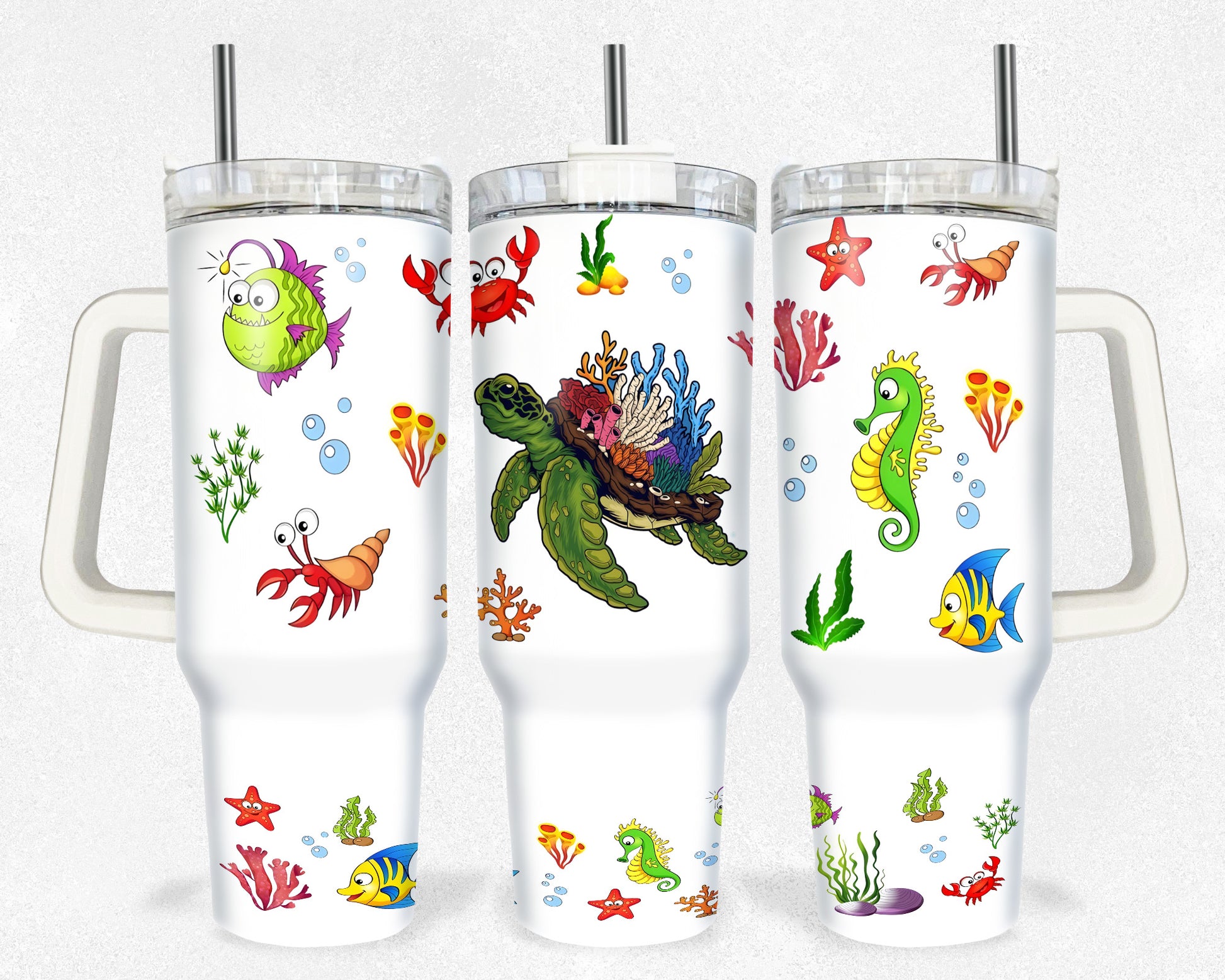 Bring the adventure of the seas to your next outdoor escapade with Sea Creatures tumbler! Crafted from Double Wall Stainless Steel, this tumbler holds hot and cold beverages and features a matching lid with three positions, handle, and 12" straw for a complete on-the-go experience. With a 9.5" length and 3.5" diameter, this tumbler fits standard cup holders for a secure fit. Refuel your spirit of adventure with Sea Creatures tumbler!