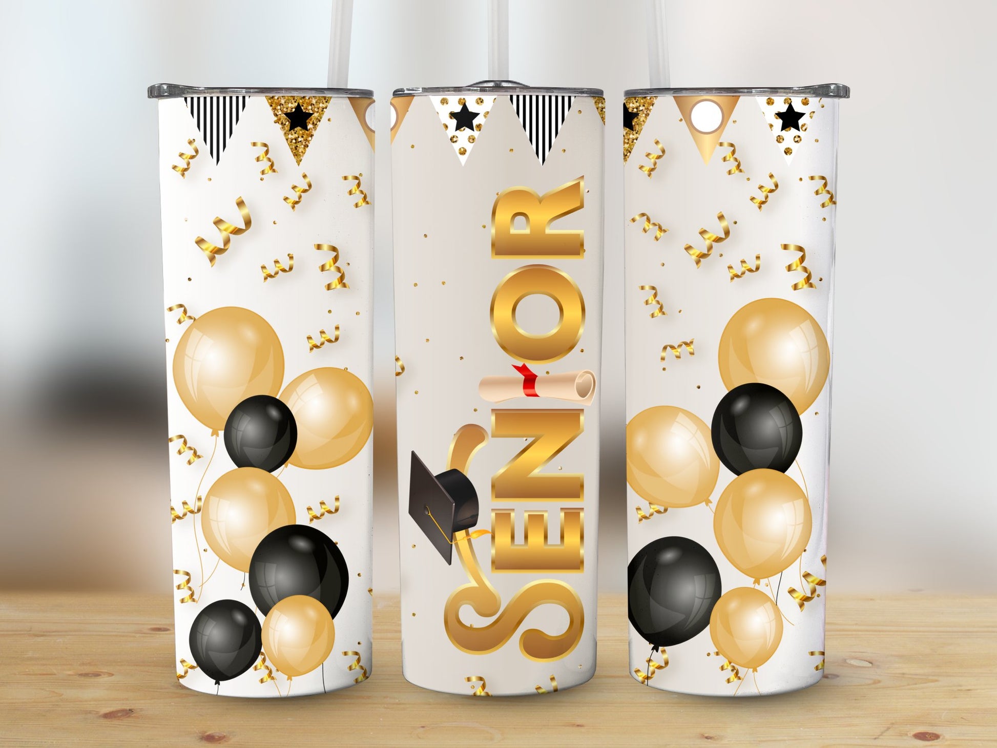 Senior Black and Gold Balloons White Background (Graduation Tumbler)