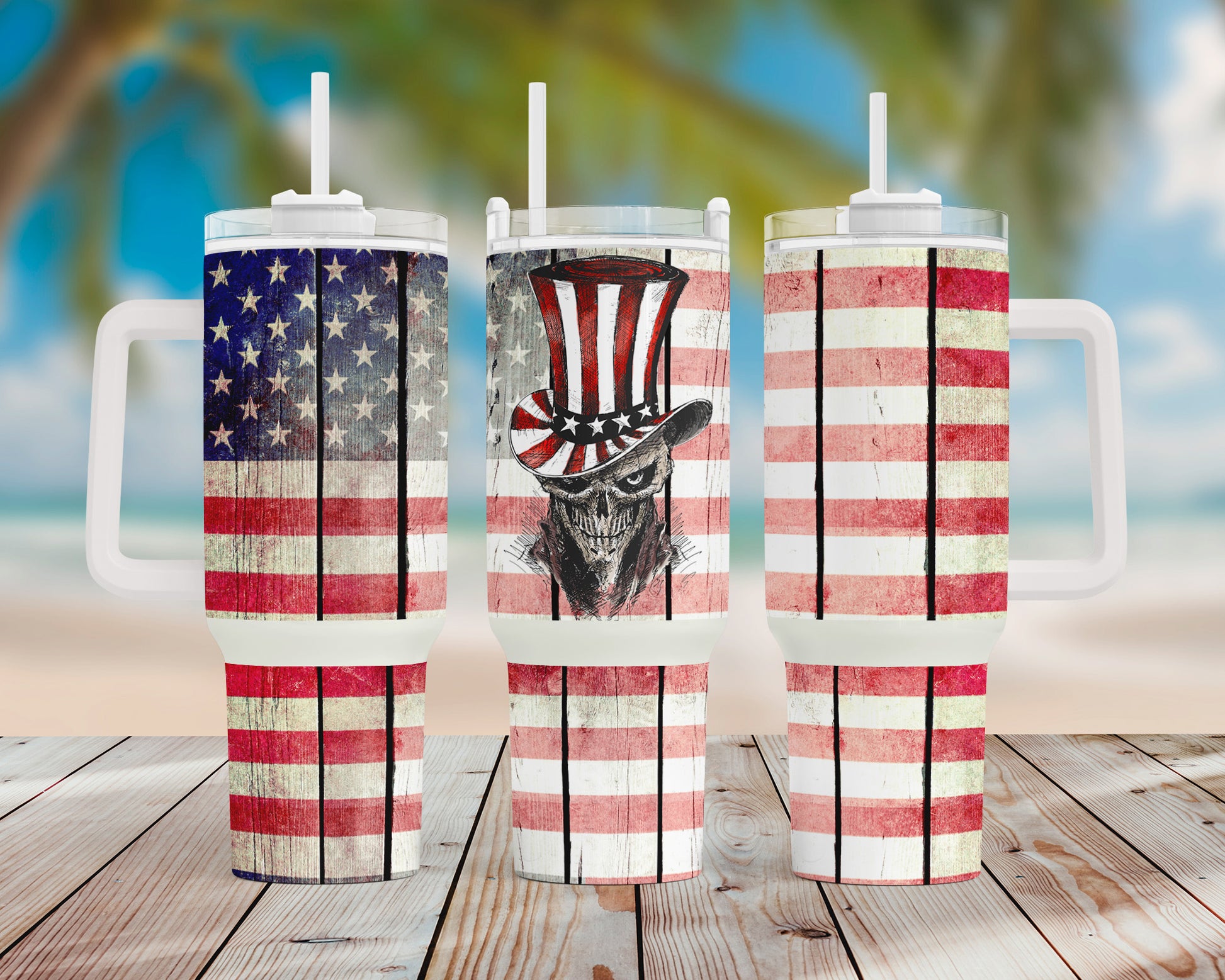This 40oz Double Wall Stainless Steel Vacuum Tumbler With Handle is the perfect companion to take with you on any outdoor adventures. It can hold both hot and cold beverages, has a matching lid with three positions, and comes with a 12” straw and a 3.5” wide handle opening. It is 9.5” long and fits car cup holders. Plus, its premium drawing of an American Flag will make sure you stand out in a crowd. Don't miss out on this unique and stylish tumbler!