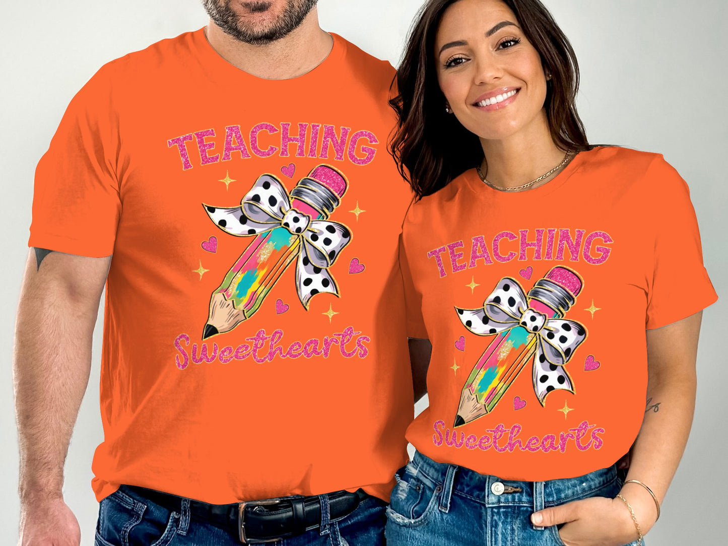 Celebrate the love for teaching with this vibrant "Teaching Sweethearts" T-shirt! Featuring a colorful pencil with a polka dot bow, surrounded by glittering stars and hearts, this shirt is perfect for any educator who adores their students. Made from soft, high-quality material, it offers comfort and style for everyday wear or special occasions at school. It's not just a shirt; it's a statement of your passion for teaching and your sweet connection with your students. Ideal as a gift or a treat for yourself, show off your teaching spirit in style!