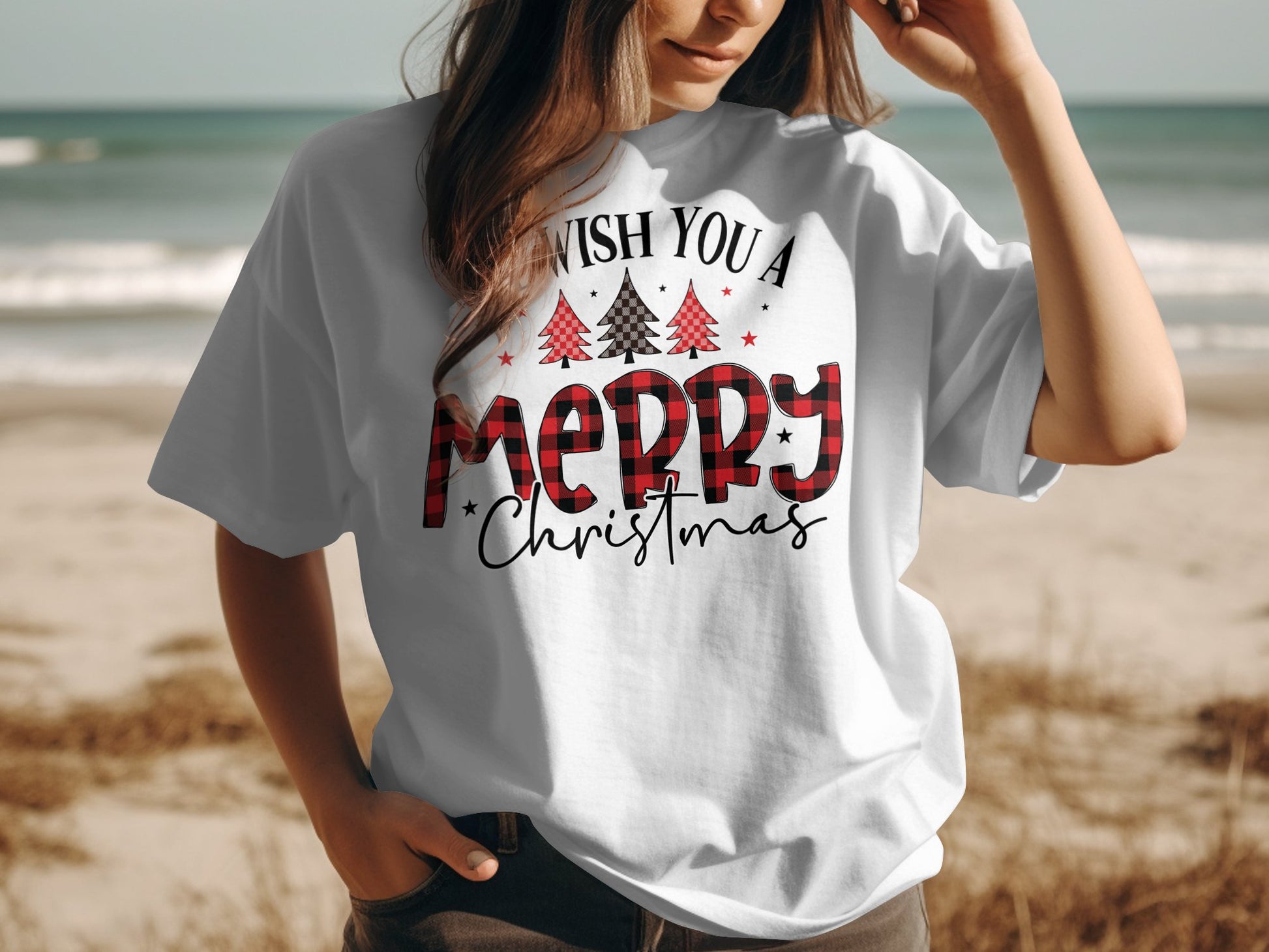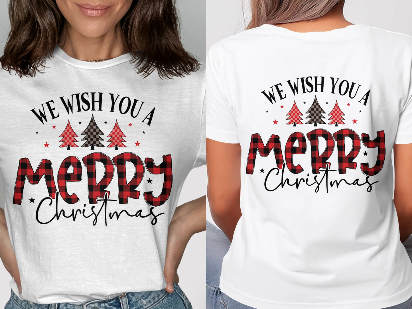 Celebrate the festive season with our "We Wish You a Merry Christmas" T-shirt. This T-shirt features a delightful plaid design with Christmas trees and the heartwarming message that brings holiday cheer. Made from high-quality materials, it ensures comfort and durability. Perfect for holiday gatherings, Christmas parties, or as a thoughtful gift for loved ones. Spread the joy of Christmas with this charming T-shirt!